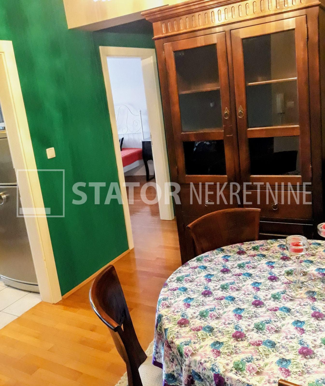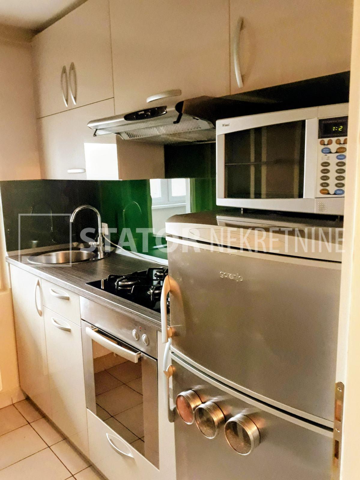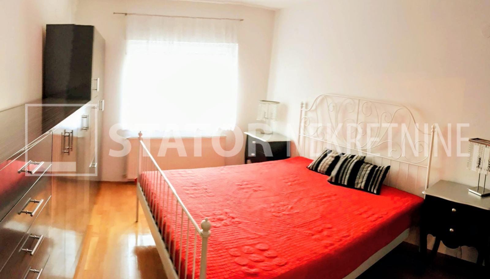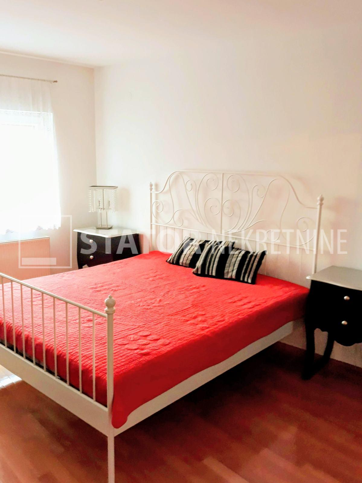 Iznajmljuje se dvosobni stan na 1. katu zgrade s liftom. Sastoji se od ulaznog hodnika u kojem su ormari, dnevne sobe sa izlaskom na loogu, blagovaonice, spavaće sobe, kuhinje i kupaonice. Stan je u potpunosti namješten i opremljen, dnevna soba sa kutnom garniturom u L, komodomo, TV – om, blagovaonica sa stolom, stolicama i policama za odlaganje, kuhinja sa elementima i svom tehnikom, spavaća soba sa velikim bračnim krevetom, ormarima i komodama za odlaganje, opremljena kupaonica u kojoj je i perilica rublja, na loggi također ugradbeni ormari.