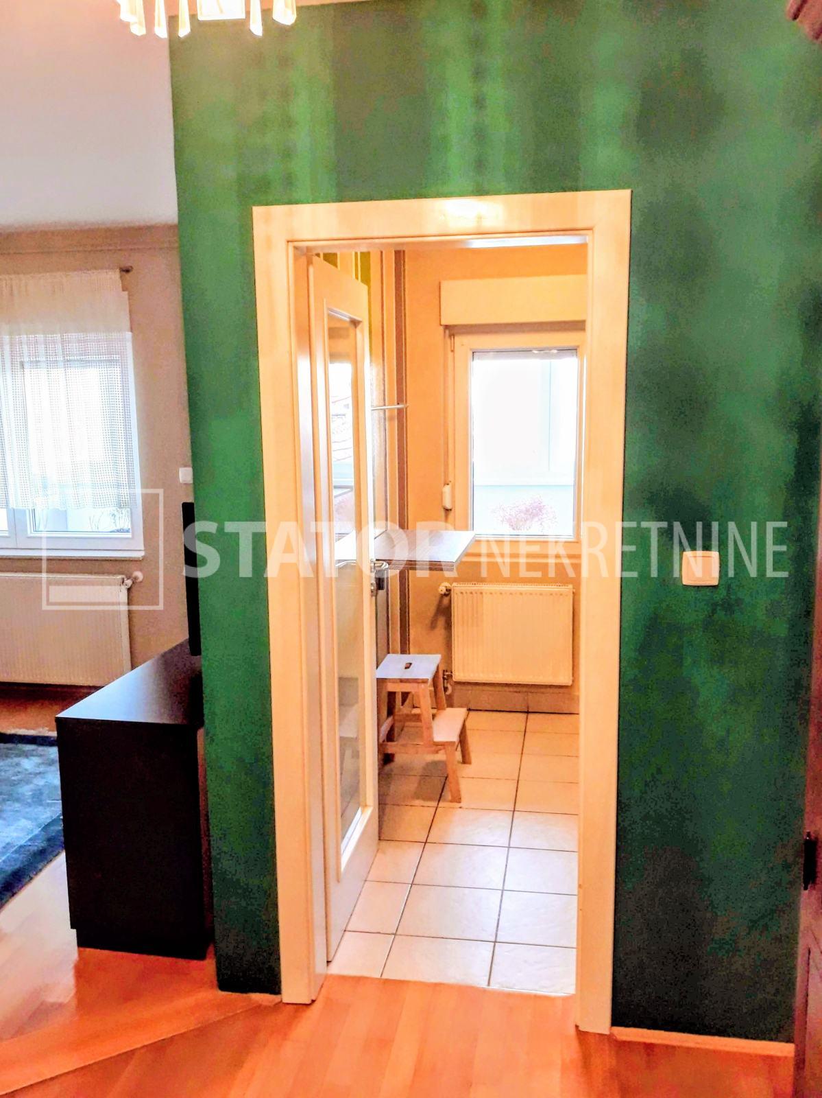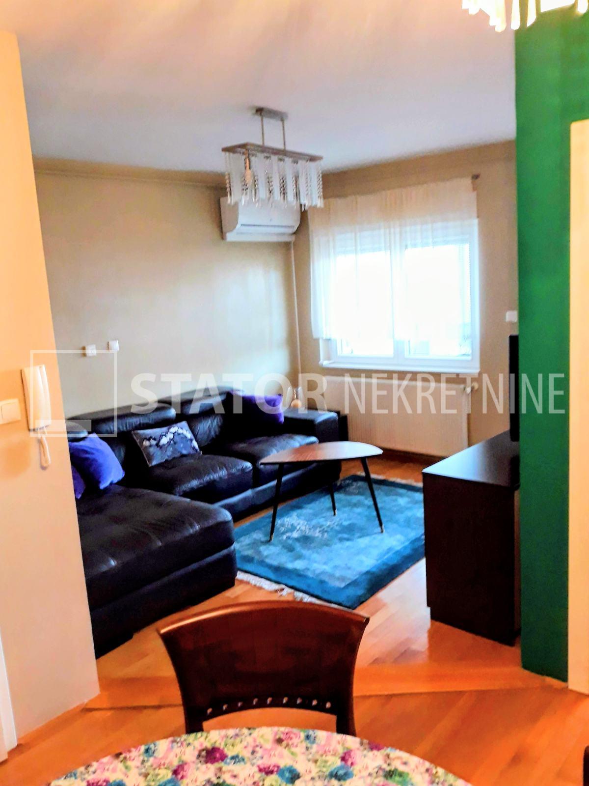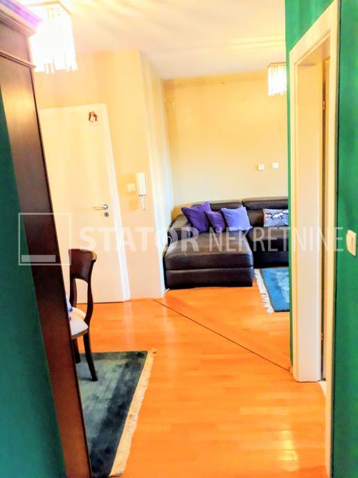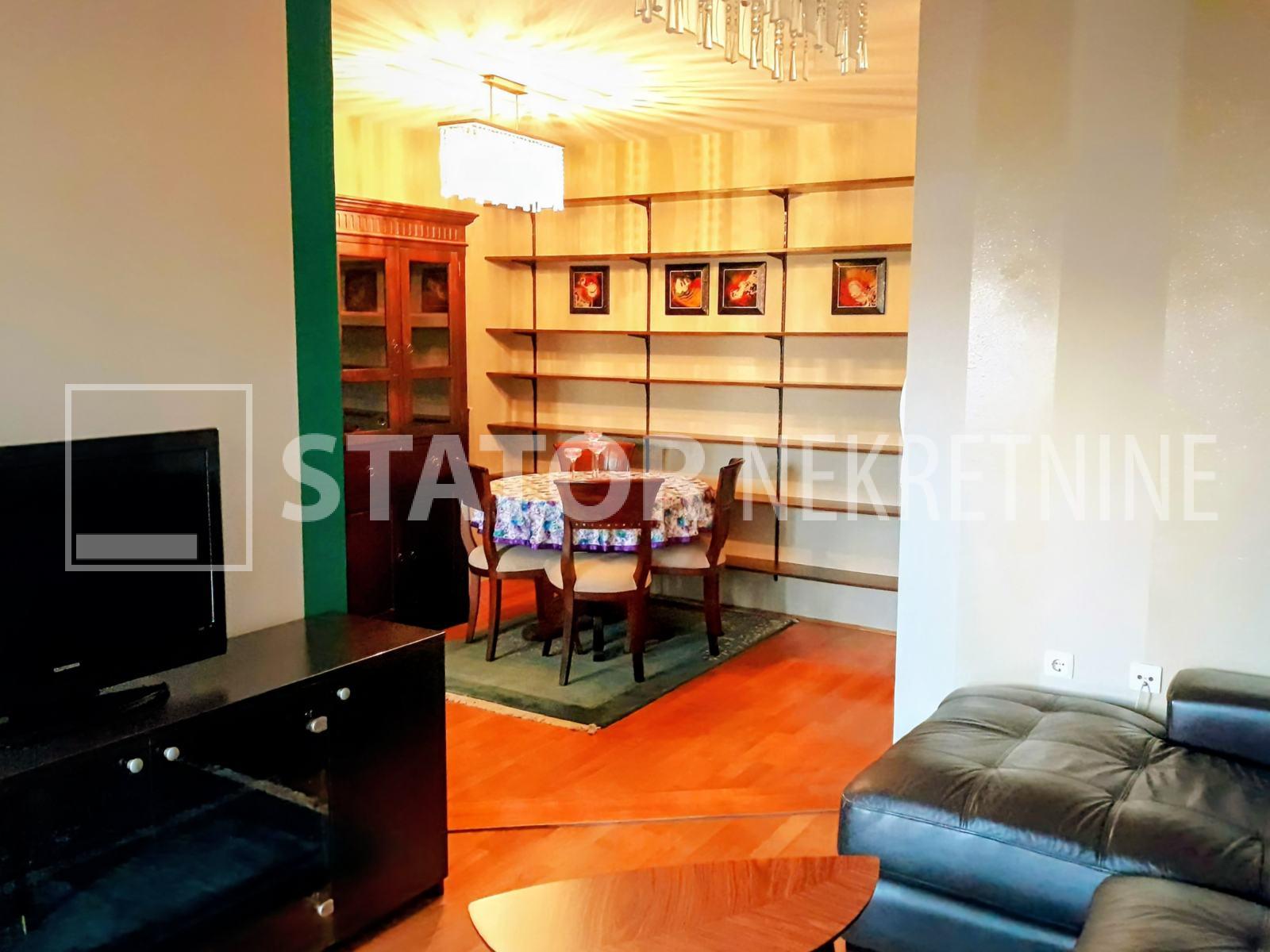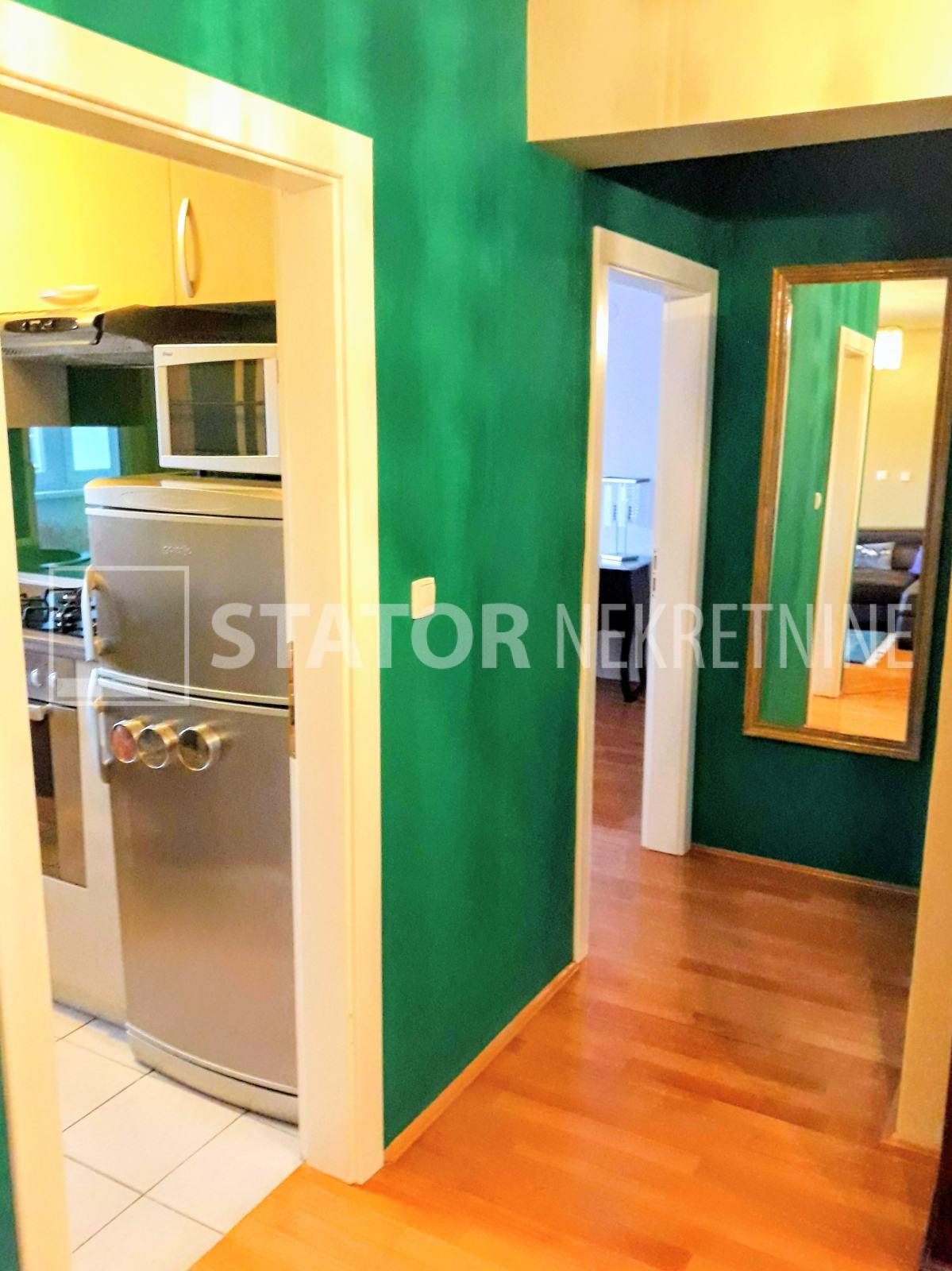 Iznajmljuje se dvosobni stan na 1. katu zgrade s liftom. Sastoji se od ulaznog hodnika u kojem su ormari, dnevne sobe sa izlaskom na loogu, blagovaonice, spavaće sobe, kuhinje i kupaonice. Stan je u potpunosti namješten i opremljen, dnevna soba sa kutnom garniturom u L, komodomo, TV – om, blagovaonica sa stolom, stolicama i policama za odlaganje, kuhinja sa elementima i svom tehnikom, spavaća soba sa velikim bračnim krevetom, ormarima i komodama za odlaganje, opremljena kupaonica u kojoj je i perilica rublja, na loggi također ugradbeni ormari.