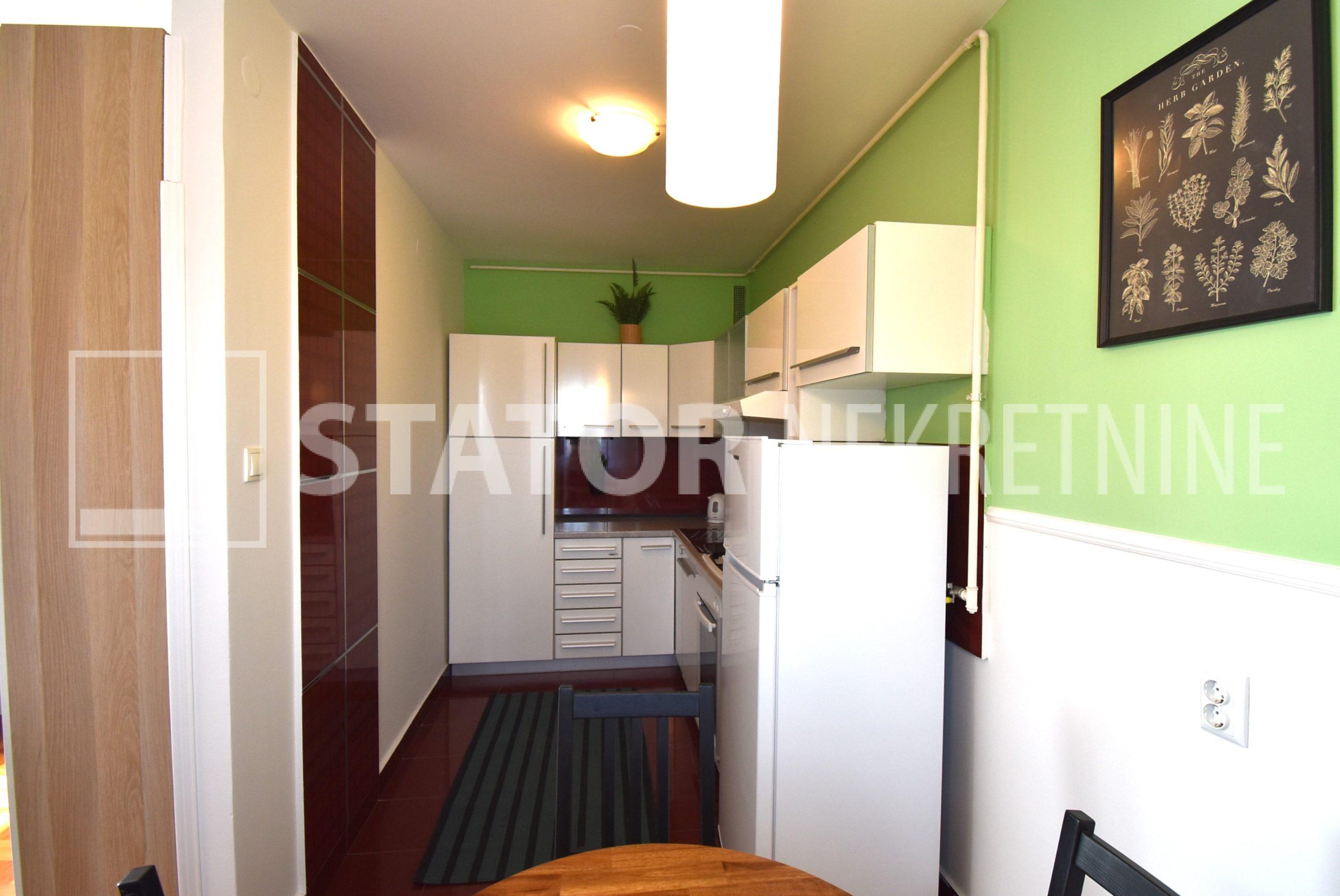 KENEEDIJEV TRG, iznajmljuje se nedavno uređen dvosobni stan na 4. katu zgrade s liftom. Sastoji se od manjeg hodnika, ravno od ulaza dnevne sobe, lijevo kuhinje sa blagovaonicom. Desno od ulaza je spavaća soba, lijevo kupaonica. Stan je u potpunosti namješten i opremljen; dnevni boravak sa trosjedom, stolom za TV, TV – om, ormarima, kuhinja sa elementima, peć sa pećnicom, hladnjak sa škrinjom za zamrzavanje, stol i stolice u blagovaonici. Spavaća soba sa novim krevetom, kupaonica sa tuš kabinom i perilicon rublja. Grijanje na toplanu, klima. N astanu su uređeni i podovi te postavljeni novi prozori. SVIJETAO, ODLIČAN STAN U ZGRADI UREDNOG ULAZA I TO SVE U !!!