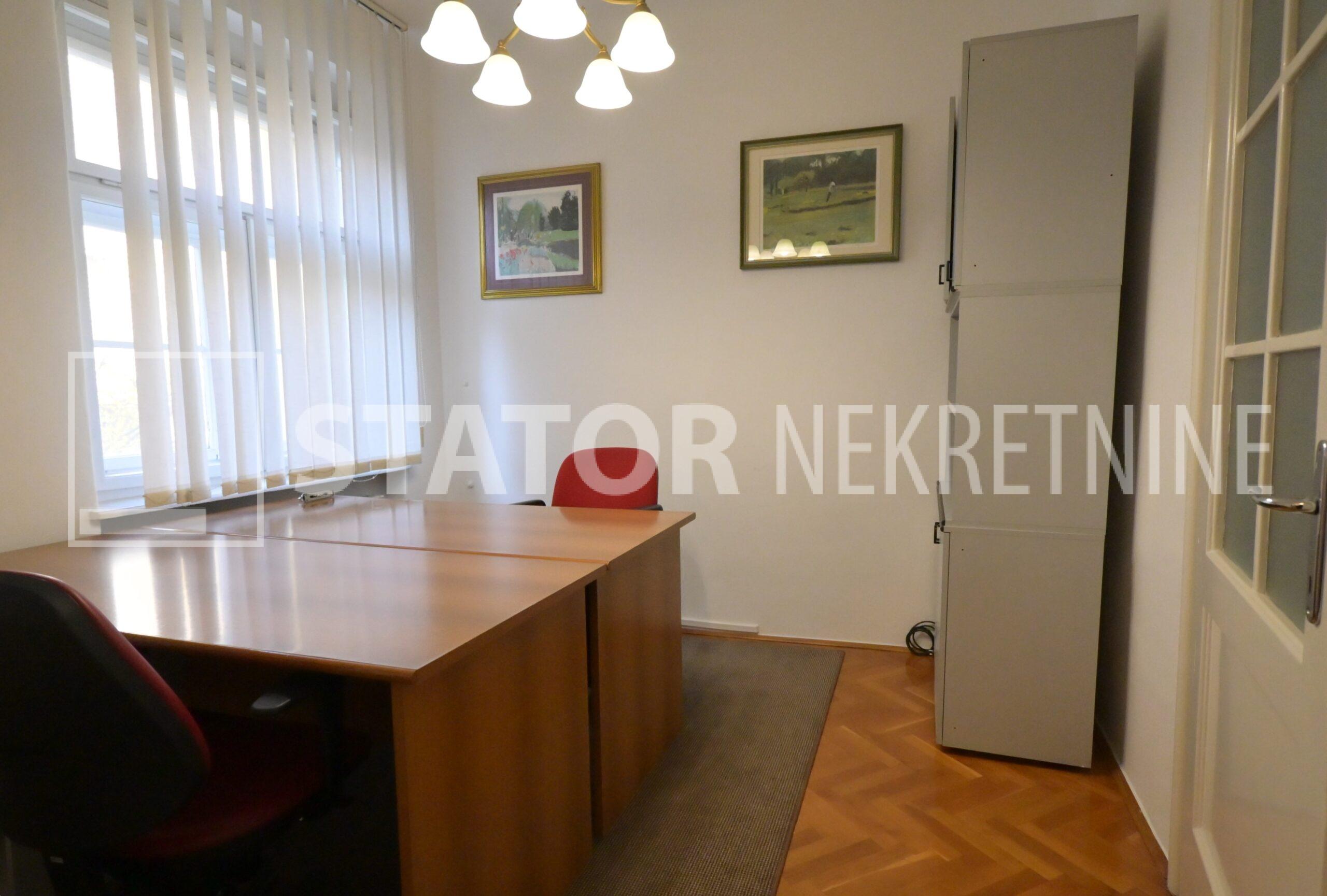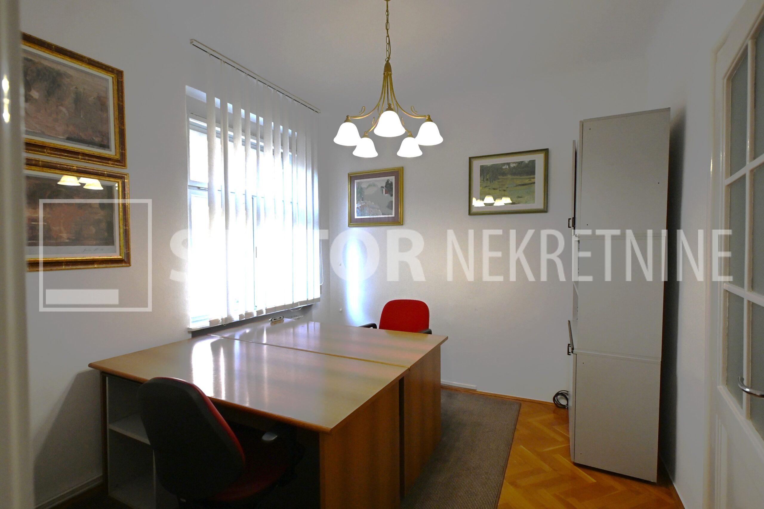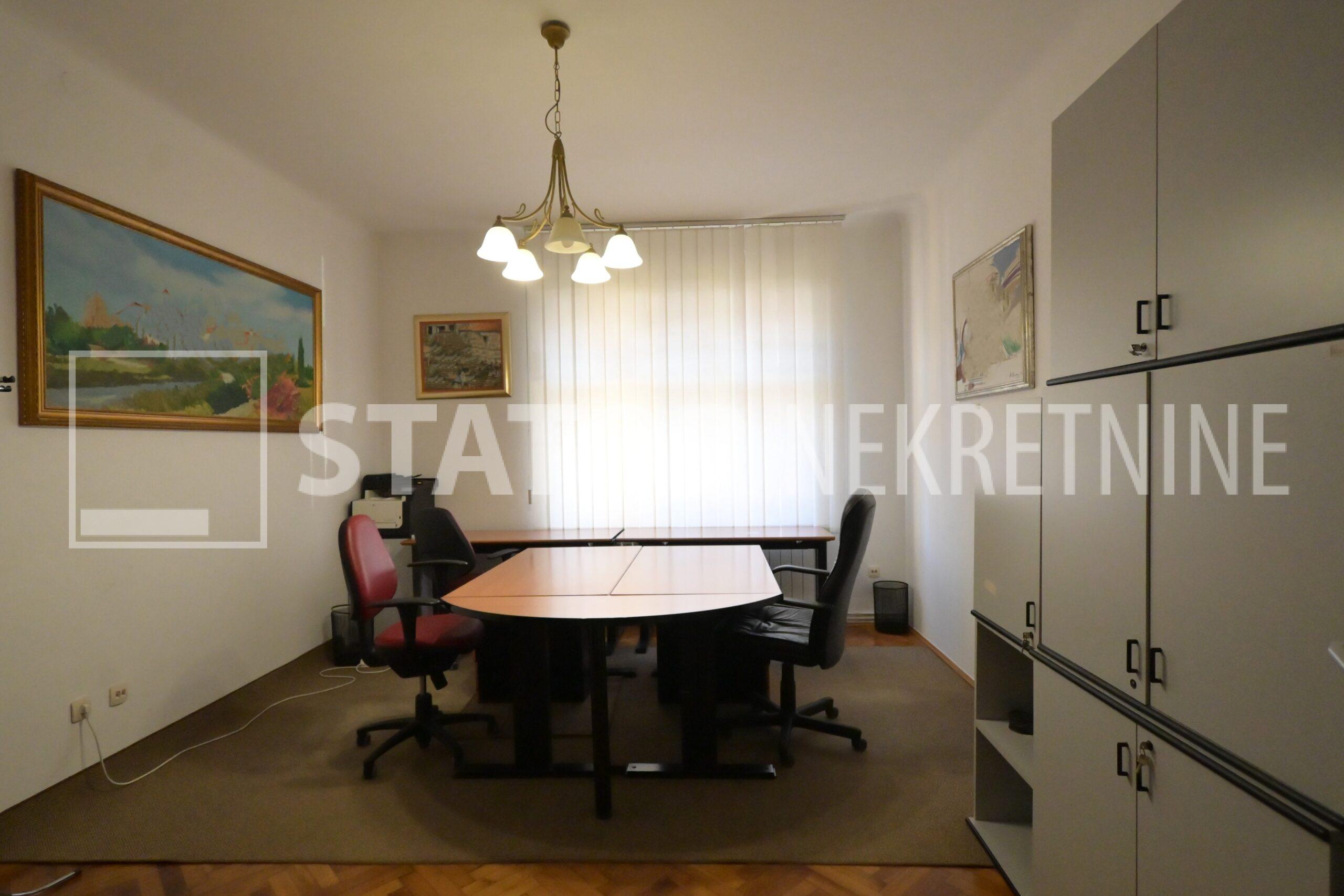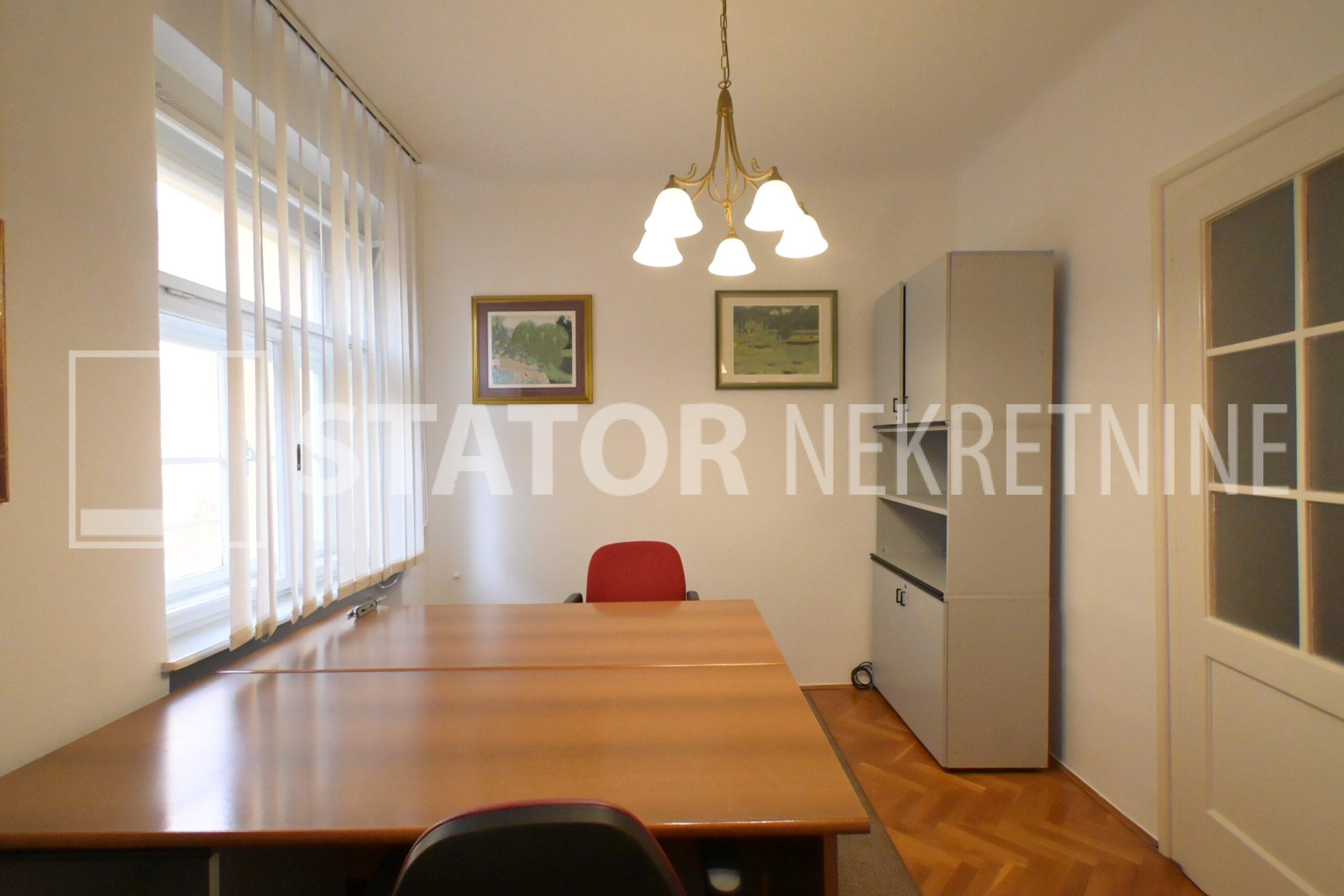 IZNAJMLJUJE se uredski prostor u visokom prizemlju manje stambene zgrade. Sastoji se od ulaznog prostora, na lijevo dvije prostorije okrenute na uličnu stranu, ravno od ulaza kupaonice sa WC – om. Desno od ulaza su dvije manje prostorije i čajna kuhinja. Sve prostorije su namještene sa radnim stolovima, stolicama i ormarima za odlaganje. Jedna od većih prostorija namjenjena je za konferenciske sastanke dok najmanja prostorija može poslužiti za arhiv. Grijanje je etažno, klima. U dvorištu je jedno parkirno mjesto. ODLIČAN, TROSTRANO ORIJETIRAN UREDSKI PROSTOR NA POŽELJNOJ ADRESI. U BLIZINI JE TRAMVAJSKA STANICA, MARKETI…