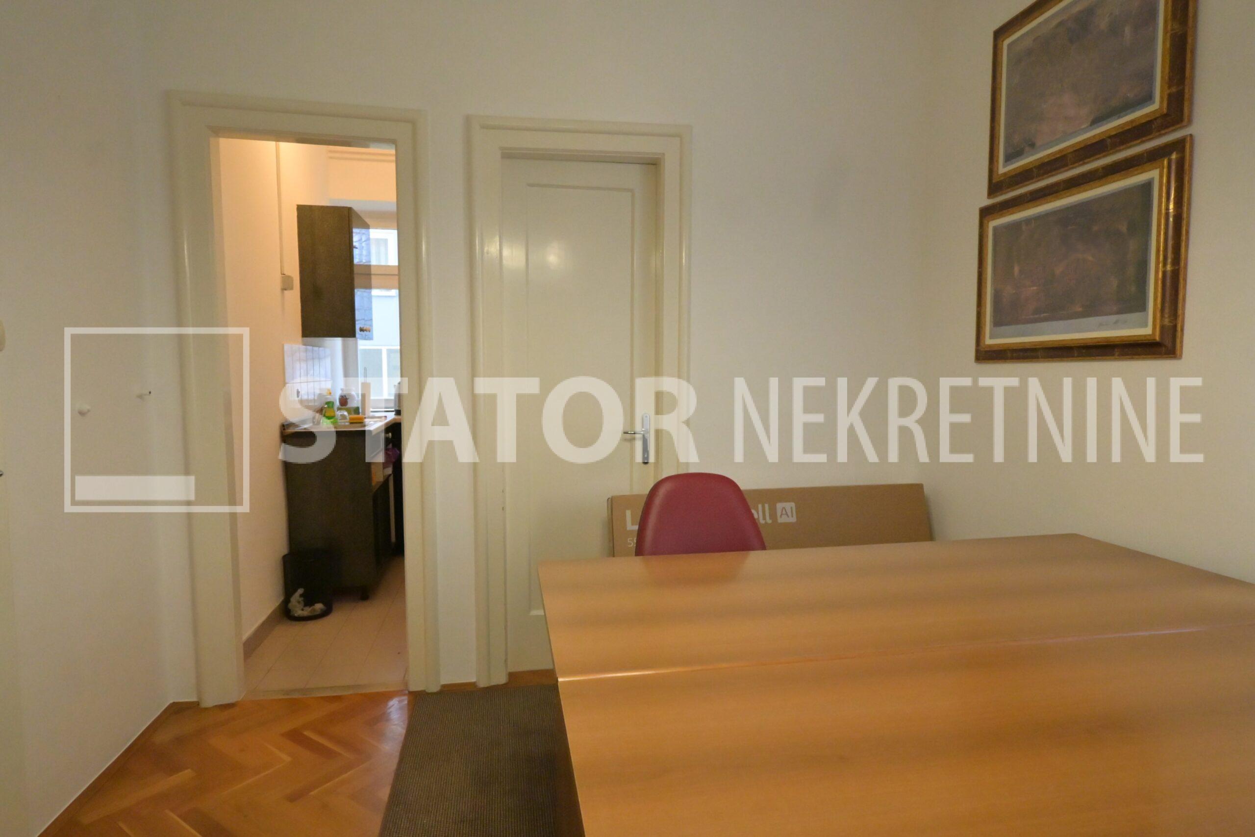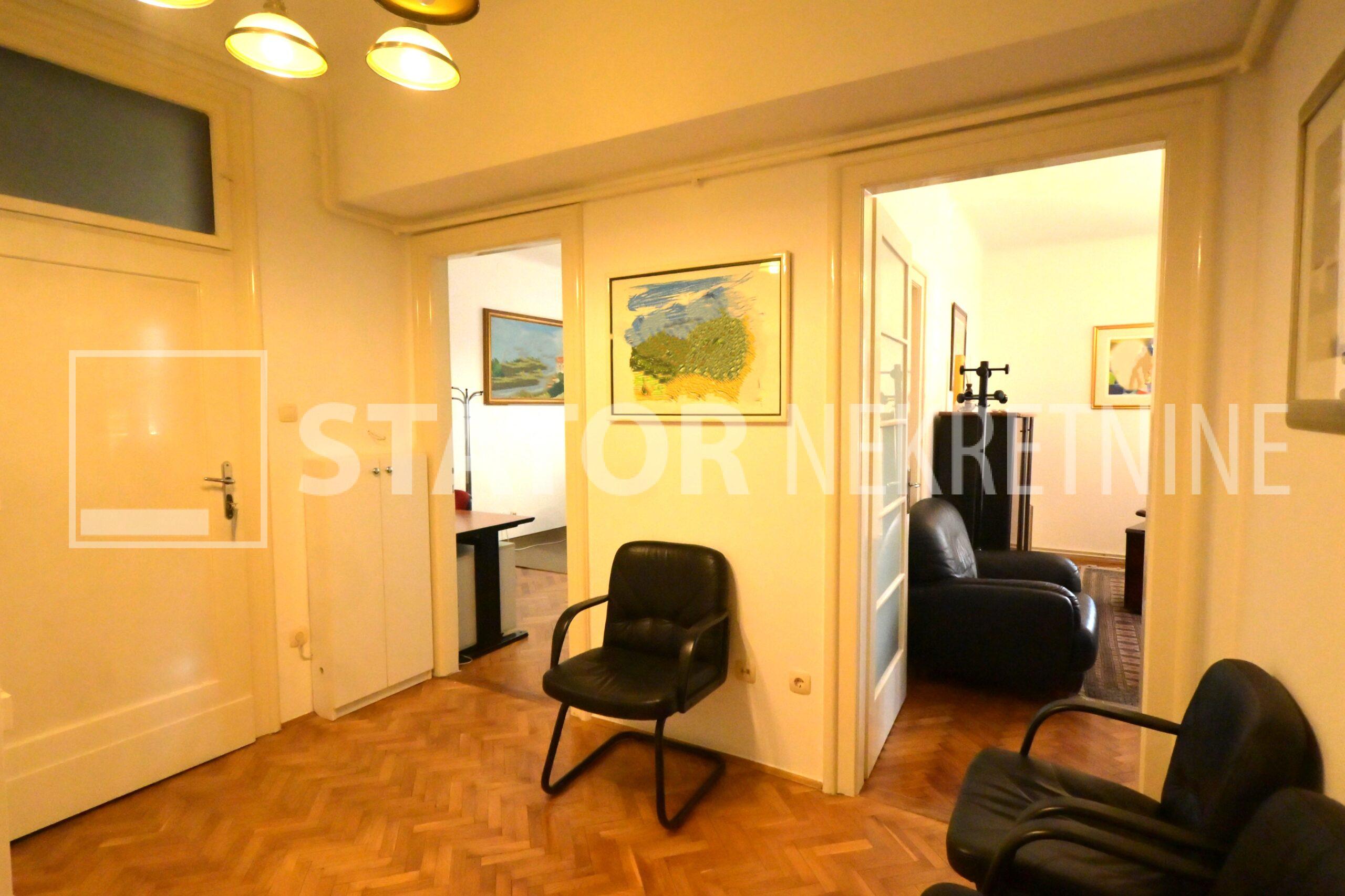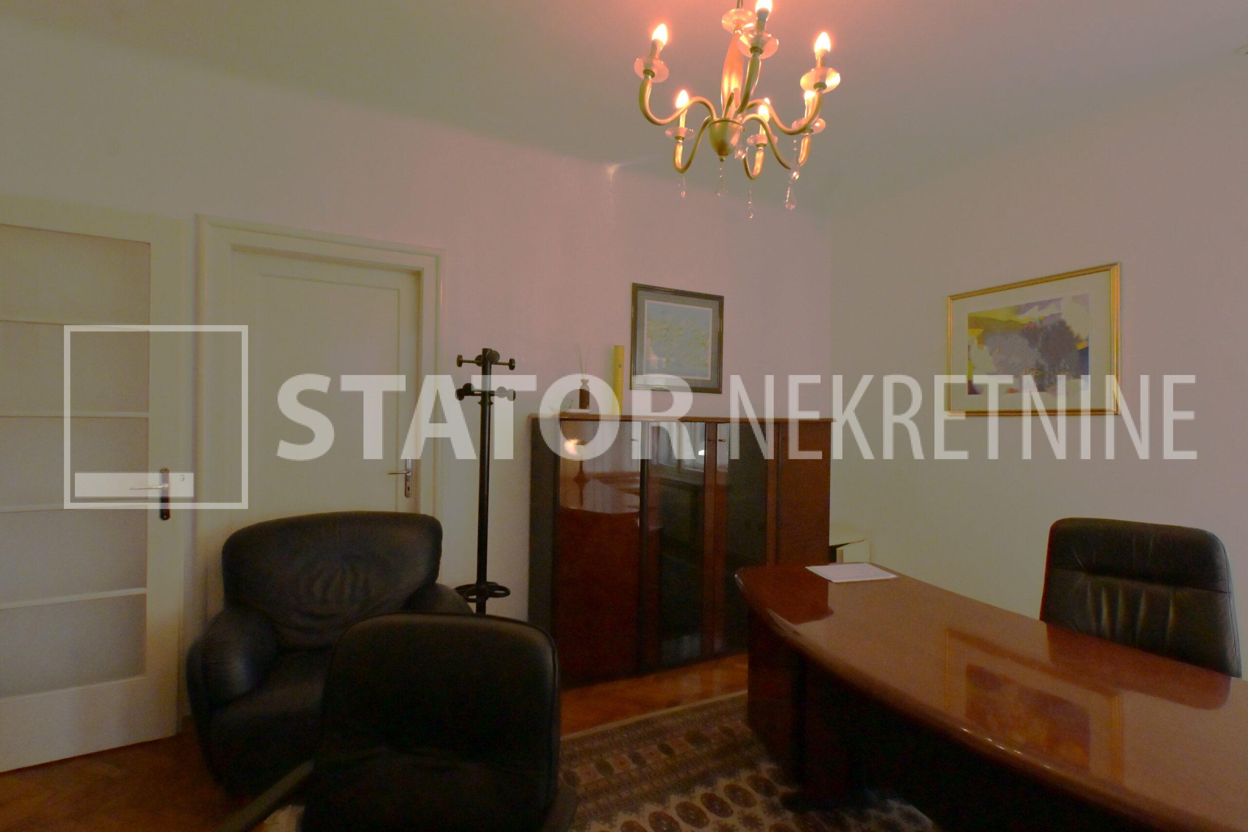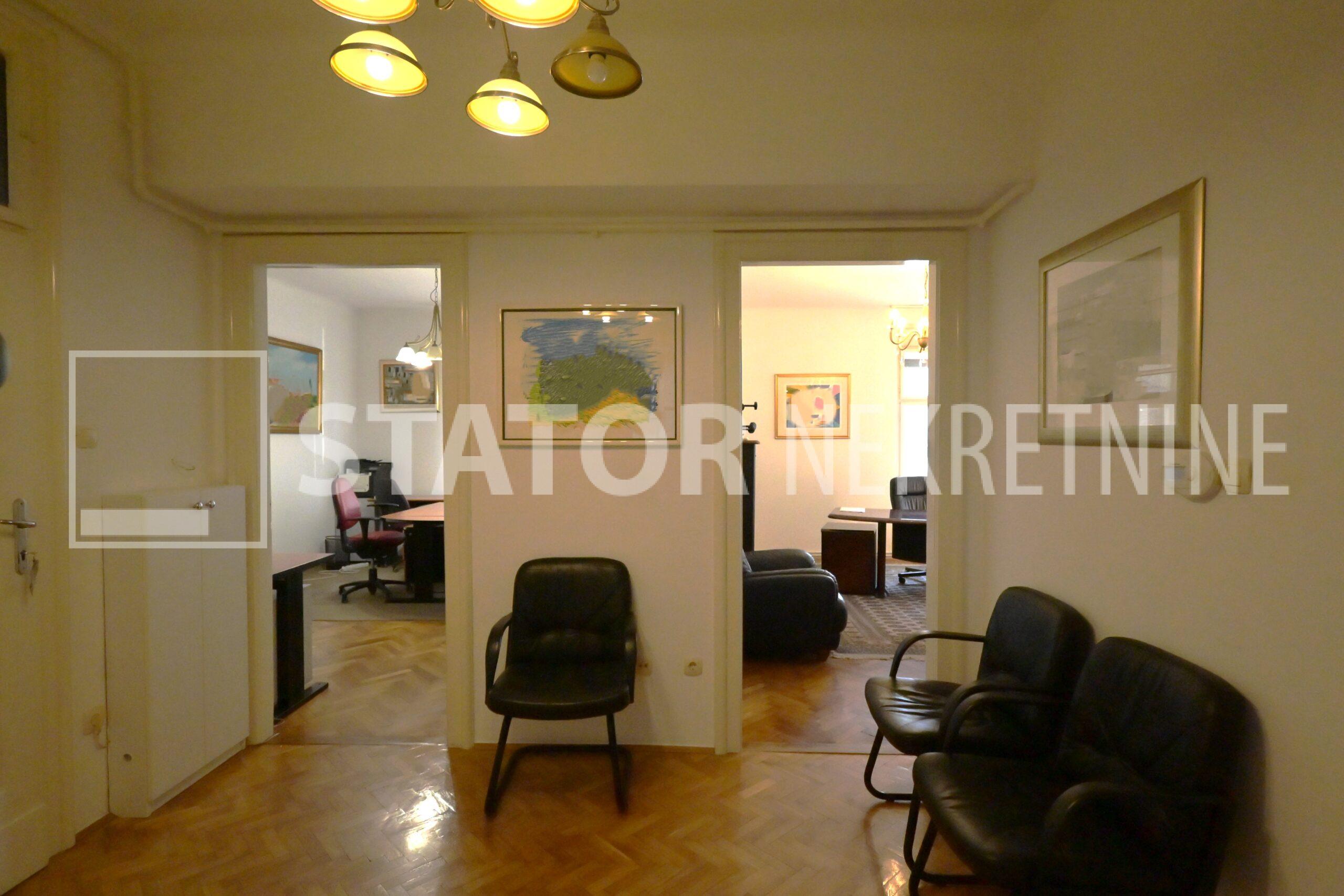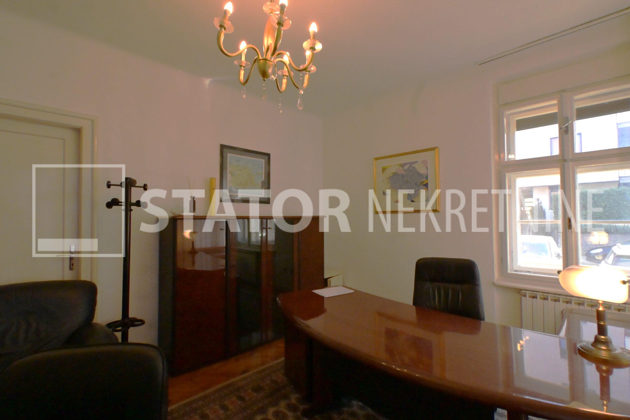 IZNAJMLJUJE se uredski prostor u visokom prizemlju manje stambene zgrade. Sastoji se od ulaznog prostora, na lijevo dvije prostorije okrenute na uličnu stranu, ravno od ulaza kupaonice sa WC – om. Desno od ulaza su dvije manje prostorije i čajna kuhinja. Sve prostorije su namještene sa radnim stolovima, stolicama i ormarima za odlaganje. Jedna od većih prostorija namjenjena je za konferenciske sastanke dok najmanja prostorija može poslužiti za arhiv. Grijanje je etažno, klima. U dvorištu je jedno parkirno mjesto. ODLIČAN, TROSTRANO ORIJETIRAN UREDSKI PROSTOR NA POŽELJNOJ ADRESI. U BLIZINI JE TRAMVAJSKA STANICA, MARKETI…