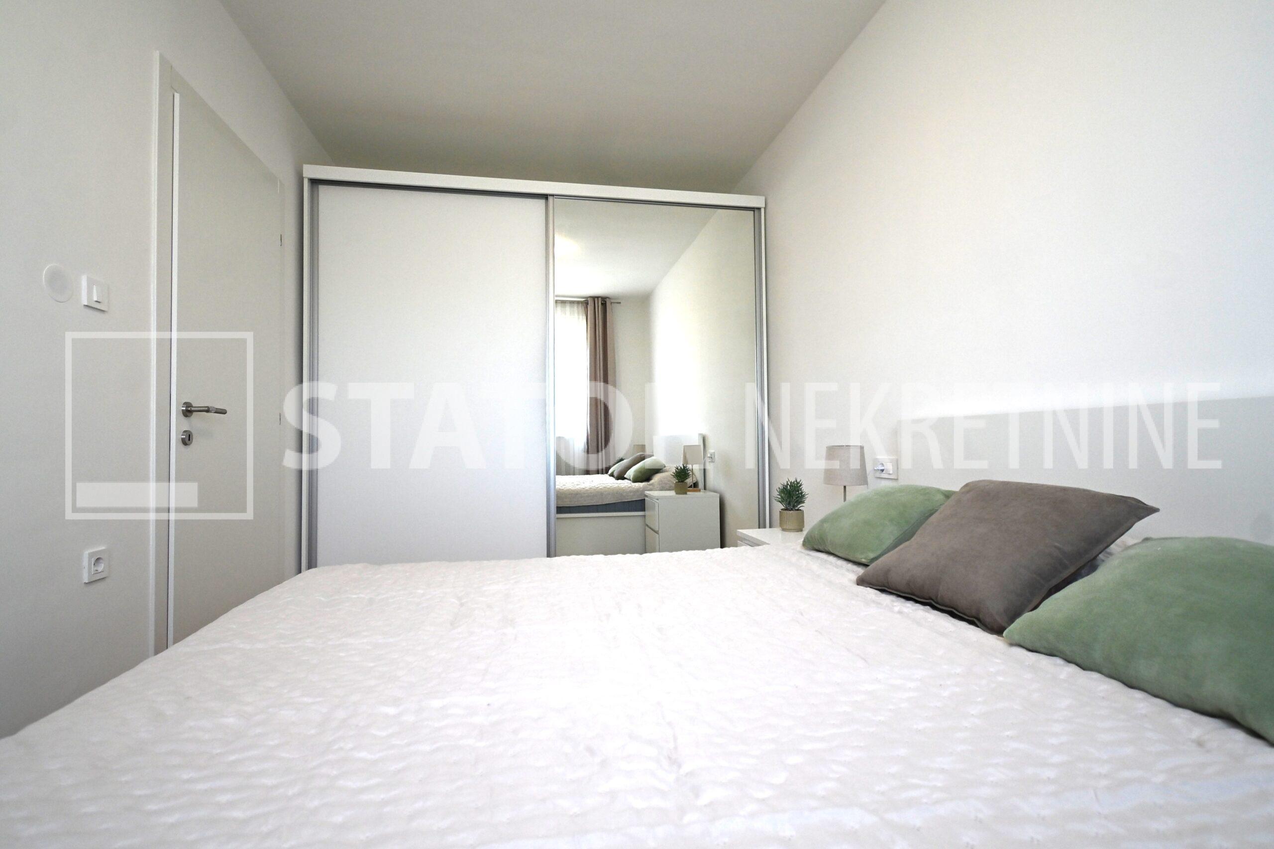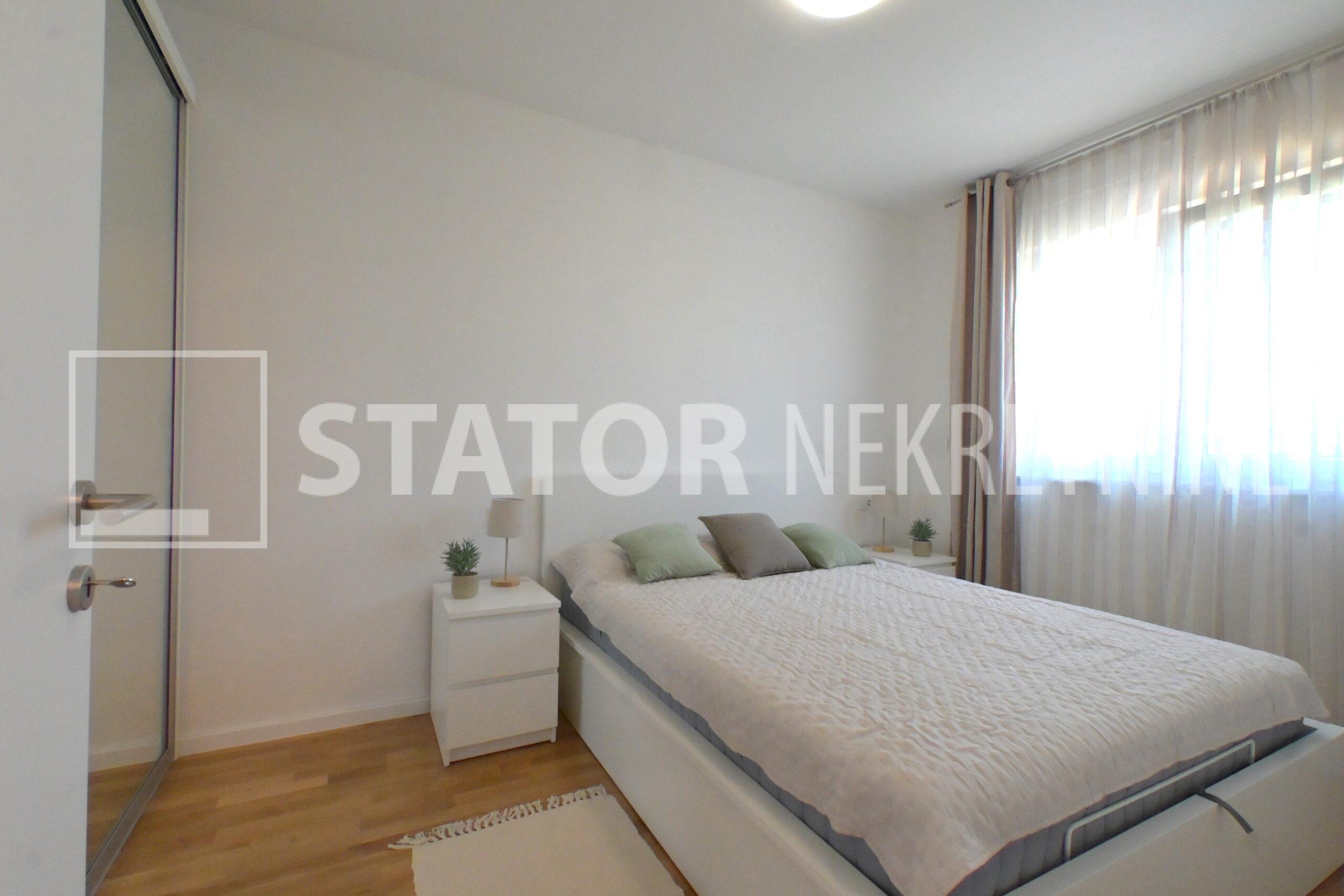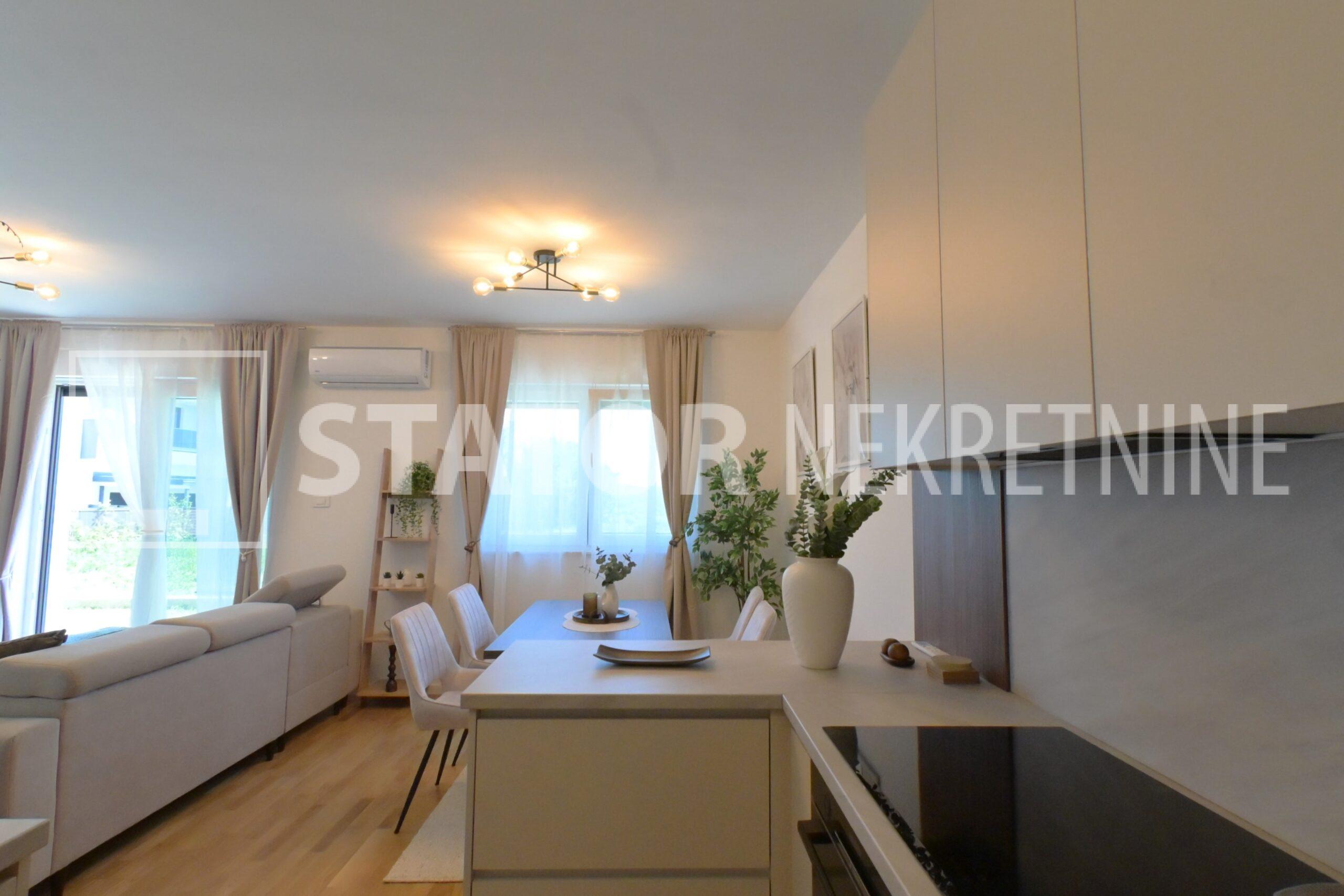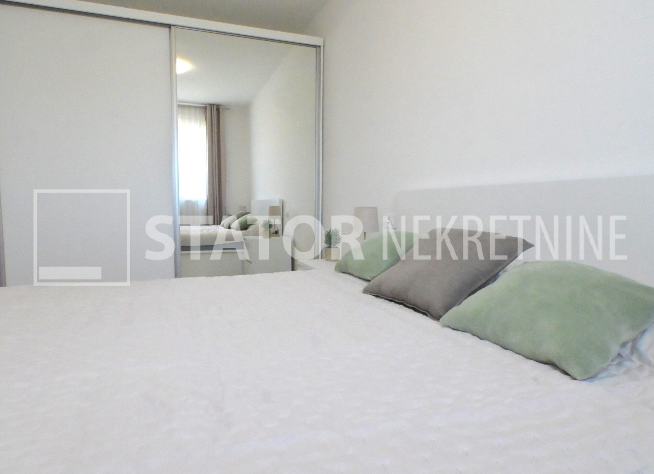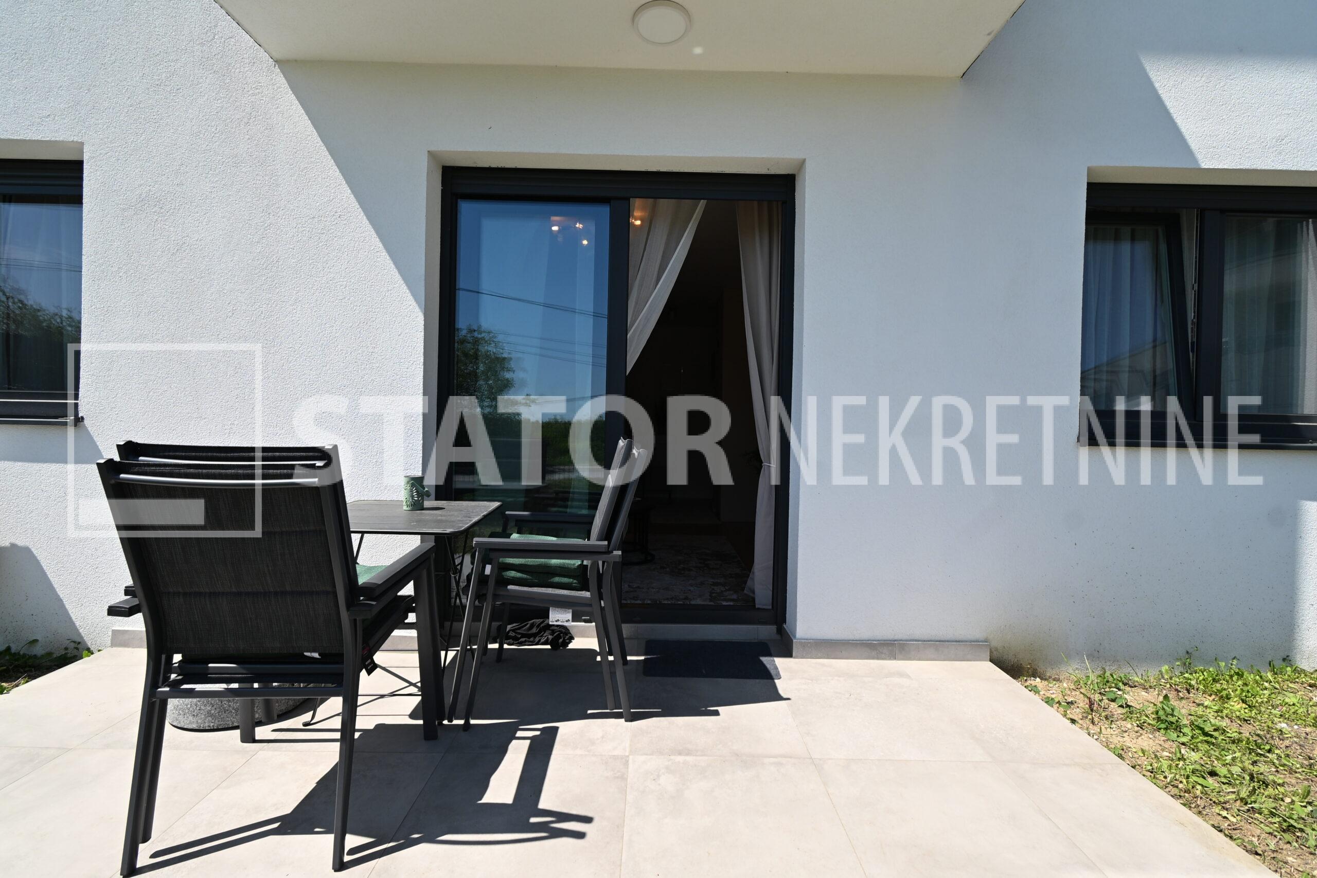 NOVOSELAČKI PUT, iznajmljuje se novi, dvosoban stan u prizemlju zgrade koji se sastoji od ulaznog prostora (4,36 m2), kupaonice (3,99 m2), dnevnog boravka s kuhinjom i blagovaonicom (26,81 m2), te spavaće sobe (11,57 m2), sve zajedno stambene površine površine 54,73 m2. Iz dnevne sobe izlazi se na terasu površine 8,00 m2 i vrt površine 24m2. Stan je u potpunosti namješten i opremljen; hodnik sa ormarom za kapute, komode za odlaganje, dnevna soba sa kutnom garniturom, stolićem za TV i TV – om, u sklopu dnevne sobe je i blagovaonica u kojoj je stol i 4 stolice. Kuhinja rađena po mjeri i maksimalno iskorištenog prostora; kuhinjski elementi sa ugradbenom peći i pećnicom, veliki hladnjak sa škrinjom za zamrzavanje, perilica posuđa, veliki kuhinjski ormari za odlaganje ili ostava, u spavaćoj sobi ugradbeni ormar i bračni krevet, kupaonica sa kadom, ormarićima za odlaganje, u kupaonici je i perilica rublja. Grijanje na dizalice topline, podno, klima. Uz stan dolazi i garaža površine 16,12m2 te mogućnost parkiranja još jednog automobila. ODLIČAN NAMJEŠTEN I U POTPUNOSTI OPREMLJEN STAN SA STILOM U MIRNOM OKRUŽENJU. NA NEKOLIKO KORAKA JE AUTOBUSNA STANICA, MERKET…..Kućni ljubimci nisu dozvoljeni.