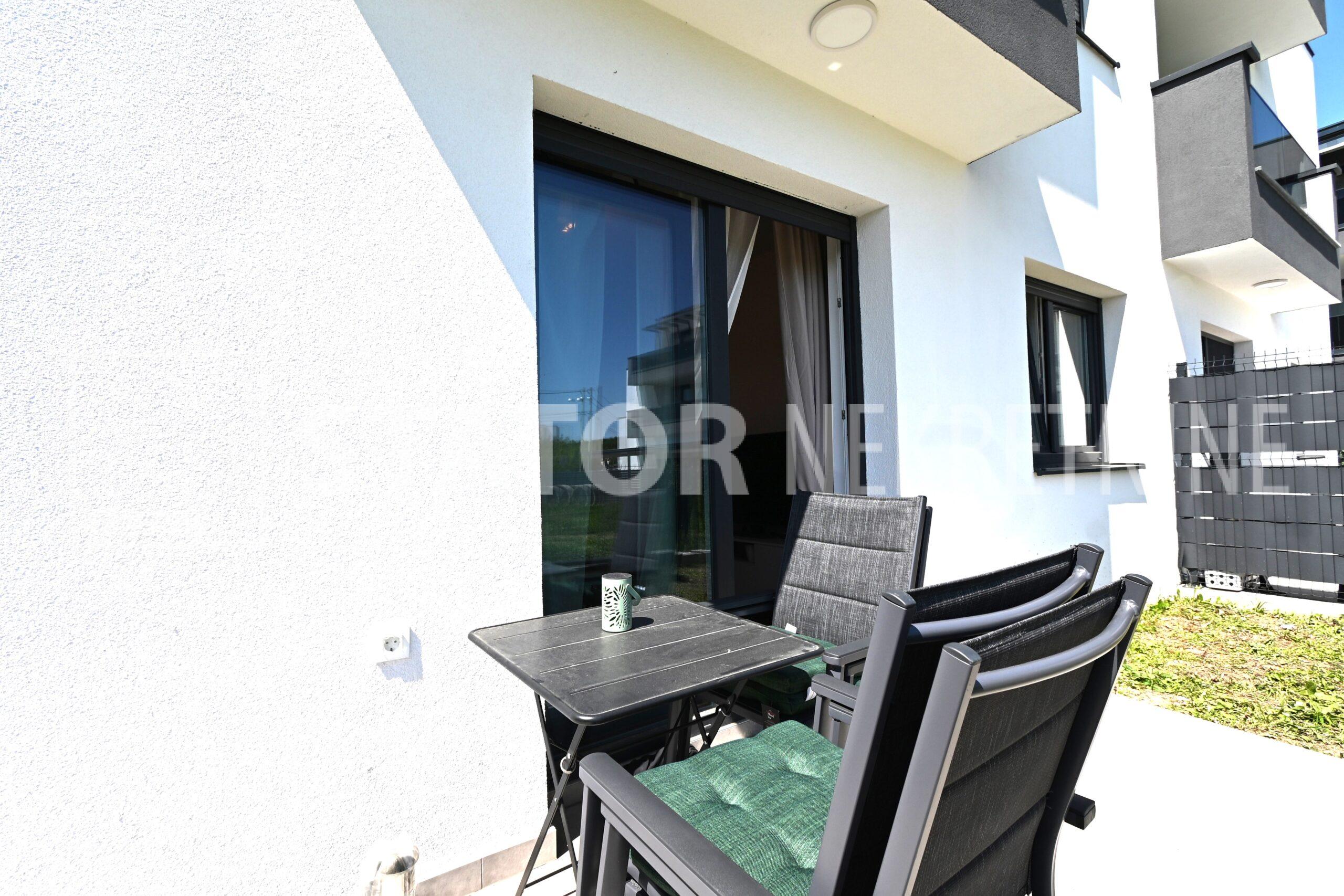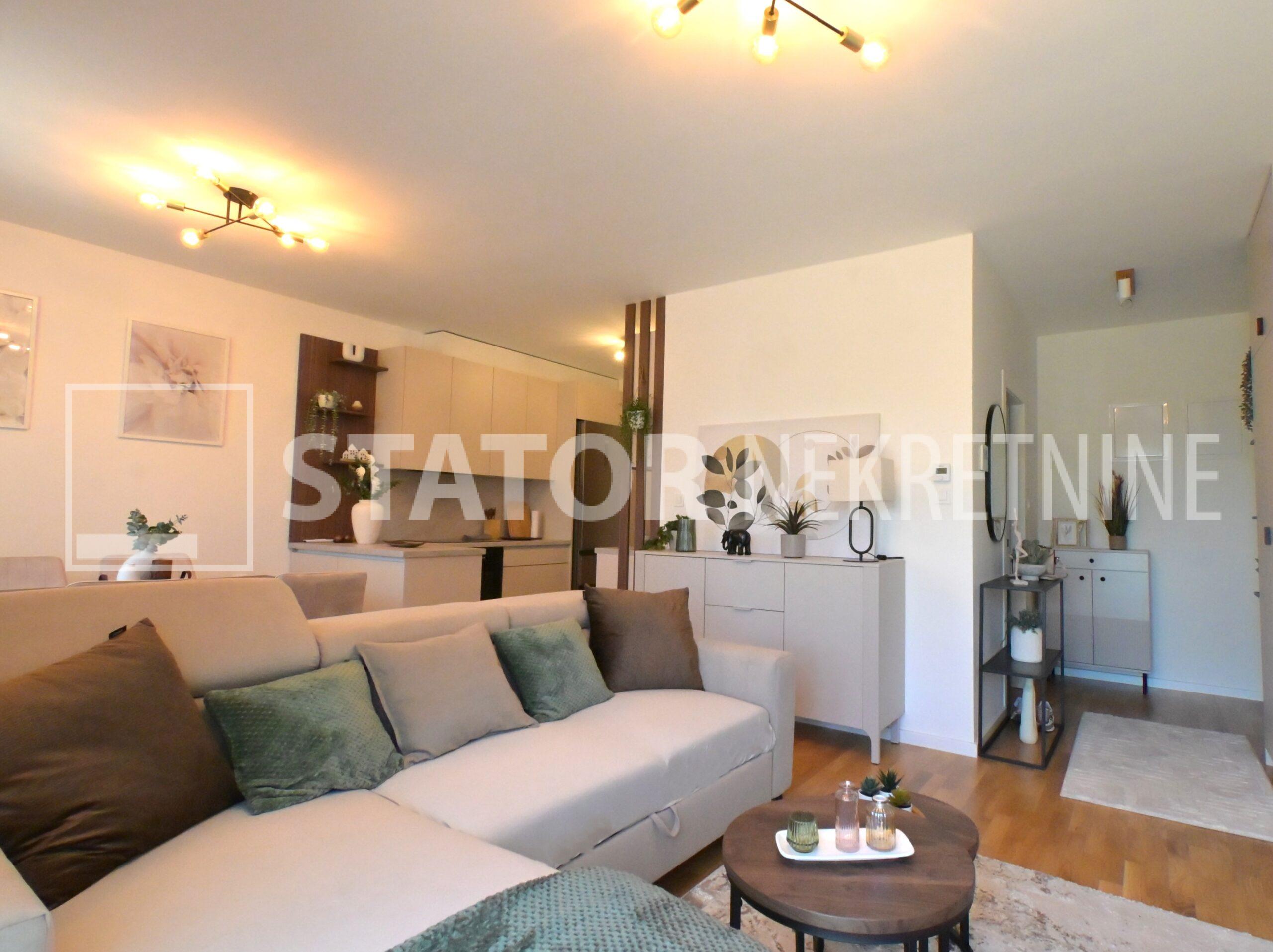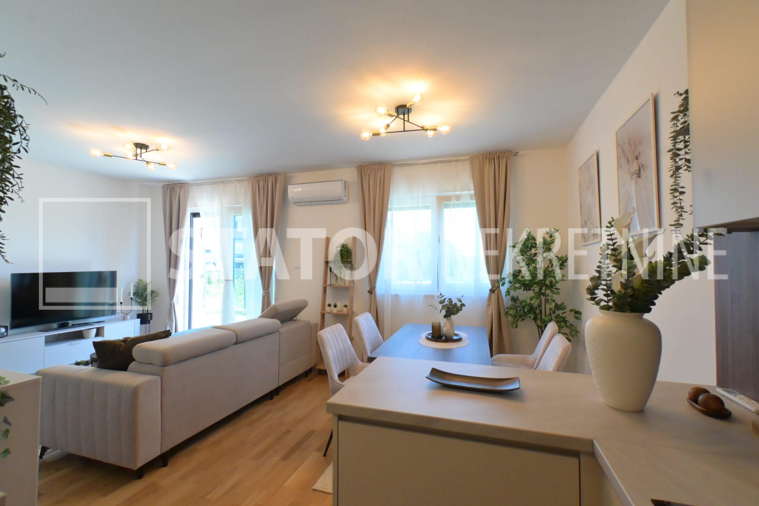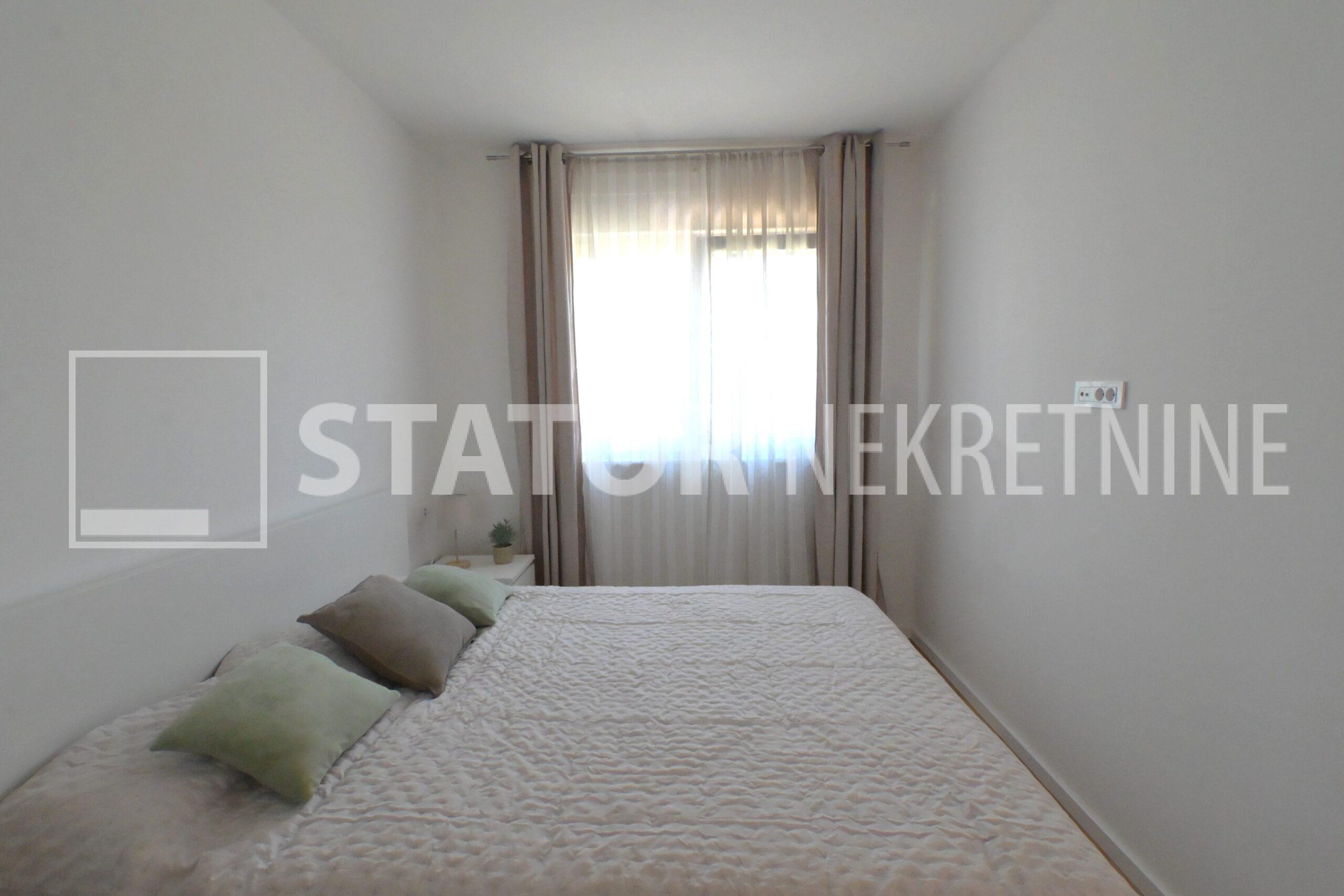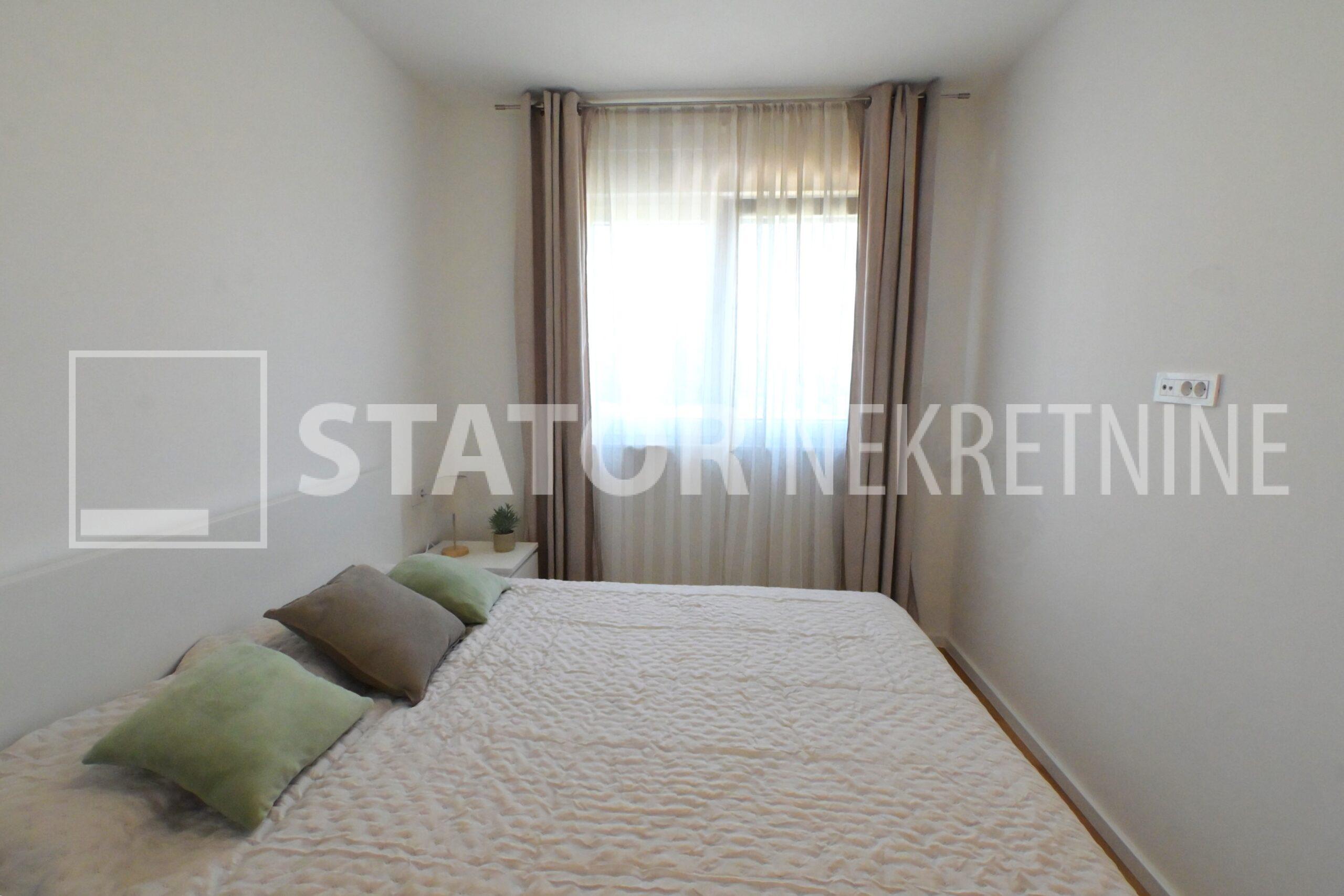 NOVOSELAČKI PUT, iznajmljuje se novi, dvosoban stan u prizemlju zgrade koji se sastoji od ulaznog prostora (4,36 m2), kupaonice (3,99 m2), dnevnog boravka s kuhinjom i blagovaonicom (26,81 m2), te spavaće sobe (11,57 m2), sve zajedno stambene površine površine 54,73 m2. Iz dnevne sobe izlazi se na terasu površine 8,00 m2 i vrt površine 24m2. Stan je u potpunosti namješten i opremljen; hodnik sa ormarom za kapute, komode za odlaganje, dnevna soba sa kutnom garniturom, stolićem za TV i TV – om, u sklopu dnevne sobe je i blagovaonica u kojoj je stol i 4 stolice. Kuhinja rađena po mjeri i maksimalno iskorištenog prostora; kuhinjski elementi sa ugradbenom peći i pećnicom, veliki hladnjak sa škrinjom za zamrzavanje, perilica posuđa, veliki kuhinjski ormari za odlaganje ili ostava, u spavaćoj sobi ugradbeni ormar i bračni krevet, kupaonica sa kadom, ormarićima za odlaganje, u kupaonici je i perilica rublja. Grijanje na dizalice topline, podno, klima. Uz stan dolazi i garaža površine 16,12m2 te mogućnost parkiranja još jednog automobila. ODLIČAN NAMJEŠTEN I U POTPUNOSTI OPREMLJEN STAN SA STILOM U MIRNOM OKRUŽENJU. NA NEKOLIKO KORAKA JE AUTOBUSNA STANICA, MERKET…..Kućni ljubimci nisu dozvoljeni.
