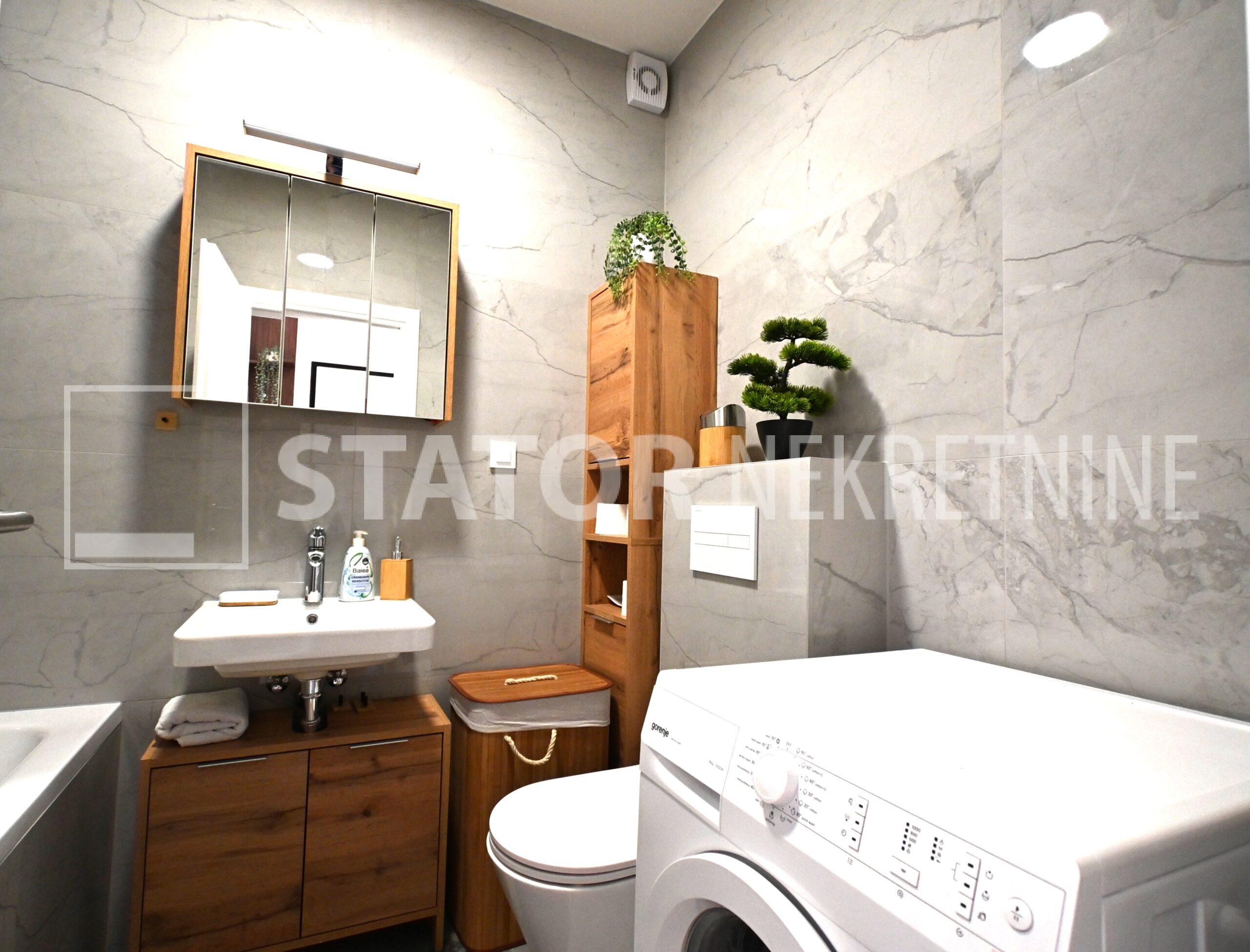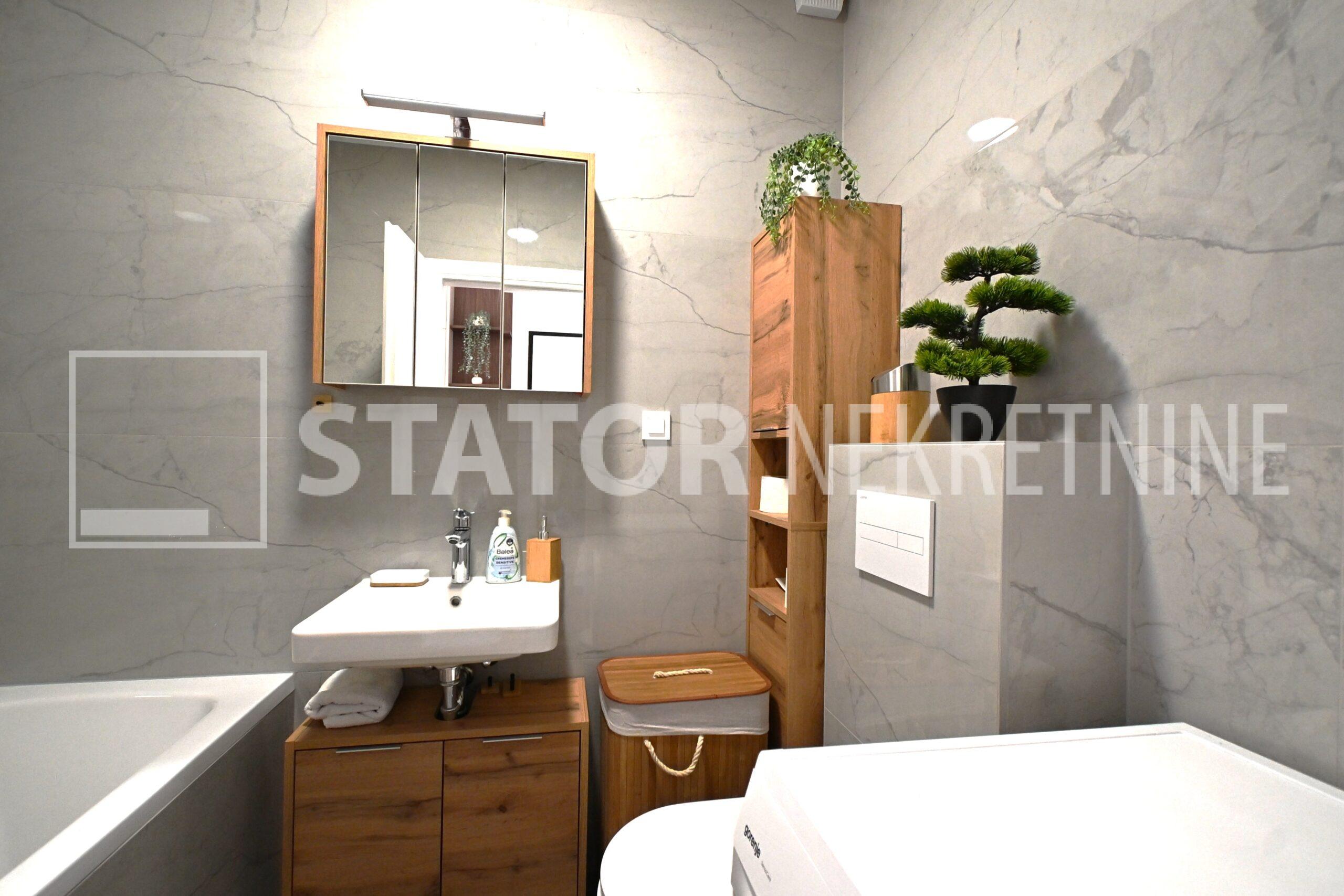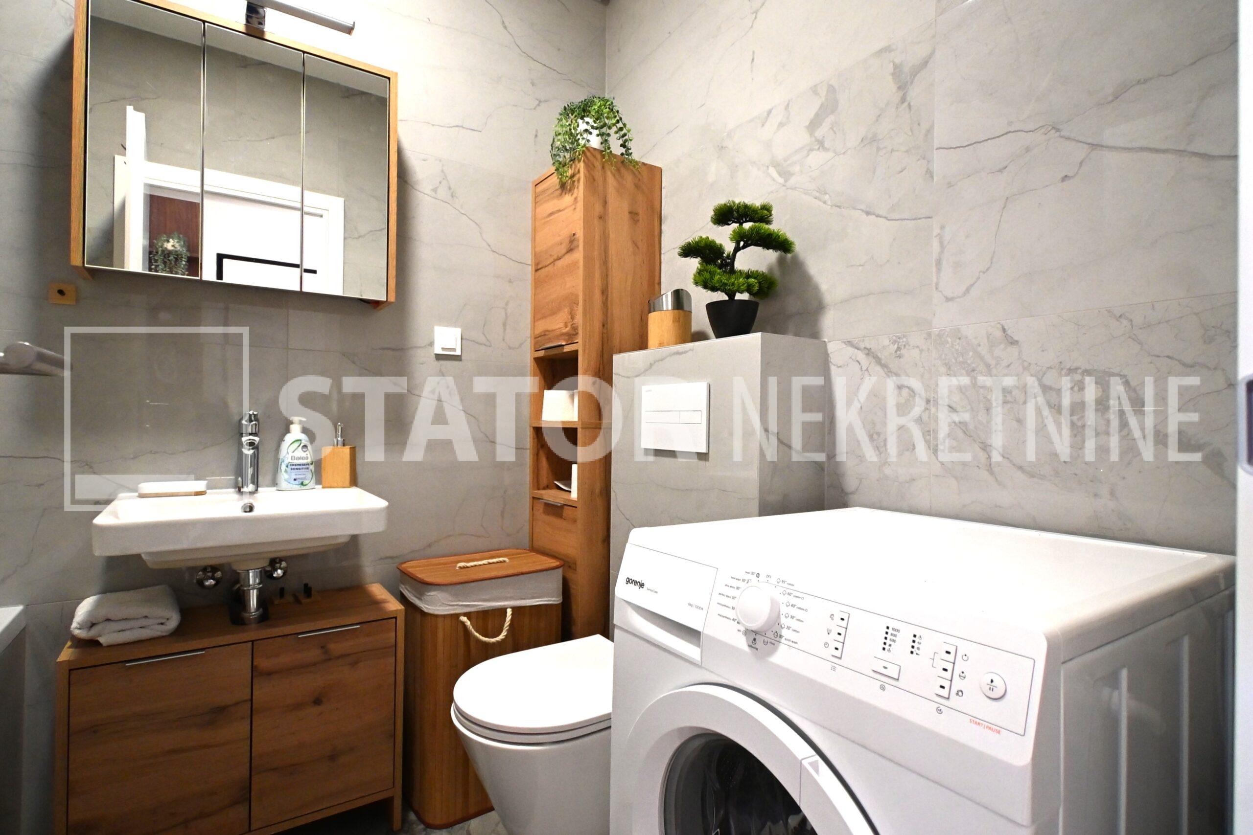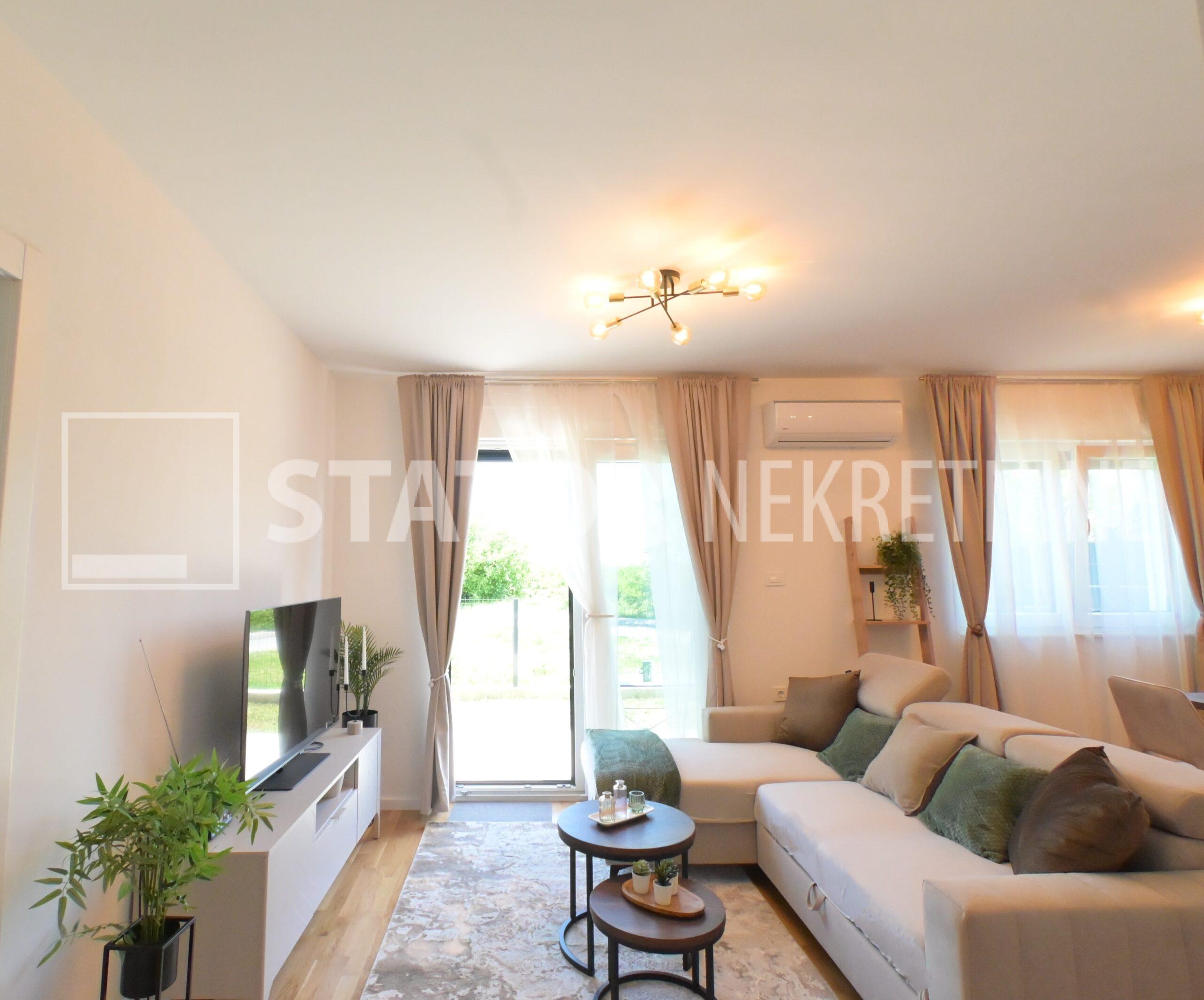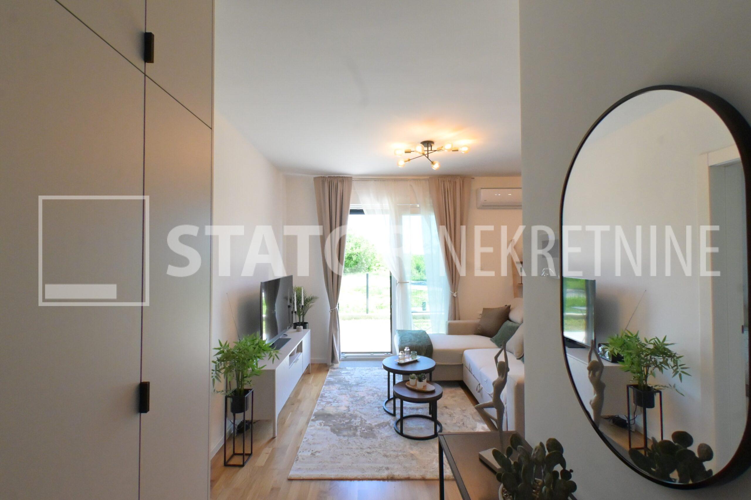 NOVOSELAČKI PUT, iznajmljuje se novi, dvosoban stan u prizemlju zgrade koji se sastoji od ulaznog prostora (4,36 m2), kupaonice (3,99 m2), dnevnog boravka s kuhinjom i blagovaonicom (26,81 m2), te spavaće sobe (11,57 m2), sve zajedno stambene površine površine 54,73 m2. Iz dnevne sobe izlazi se na terasu površine 8,00 m2 i vrt površine 24m2. Stan je u potpunosti namješten i opremljen; hodnik sa ormarom za kapute, komode za odlaganje, dnevna soba sa kutnom garniturom, stolićem za TV i TV – om, u sklopu dnevne sobe je i blagovaonica u kojoj je stol i 4 stolice. Kuhinja rađena po mjeri i maksimalno iskorištenog prostora; kuhinjski elementi sa ugradbenom peći i pećnicom, veliki hladnjak sa škrinjom za zamrzavanje, perilica posuđa, veliki kuhinjski ormari za odlaganje ili ostava, u spavaćoj sobi ugradbeni ormar i bračni krevet, kupaonica sa kadom, ormarićima za odlaganje, u kupaonici je i perilica rublja. Grijanje na dizalice topline, podno, klima. Uz stan dolazi i garaža površine 16,12m2 te mogućnost parkiranja još jednog automobila. ODLIČAN NAMJEŠTEN I U POTPUNOSTI OPREMLJEN STAN SA STILOM U MIRNOM OKRUŽENJU. NA NEKOLIKO KORAKA JE AUTOBUSNA STANICA, MERKET…..Kućni ljubimci nisu dozvoljeni.
