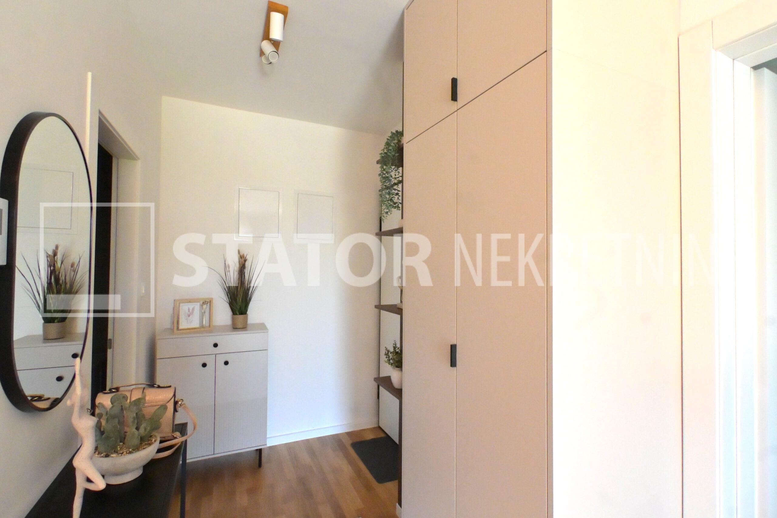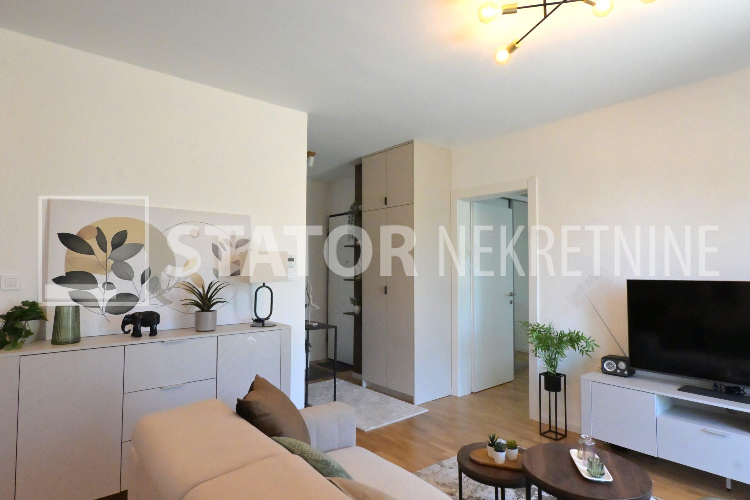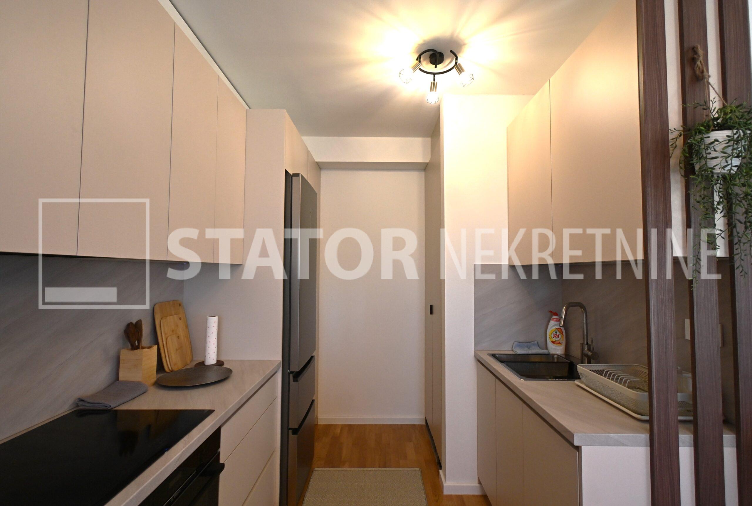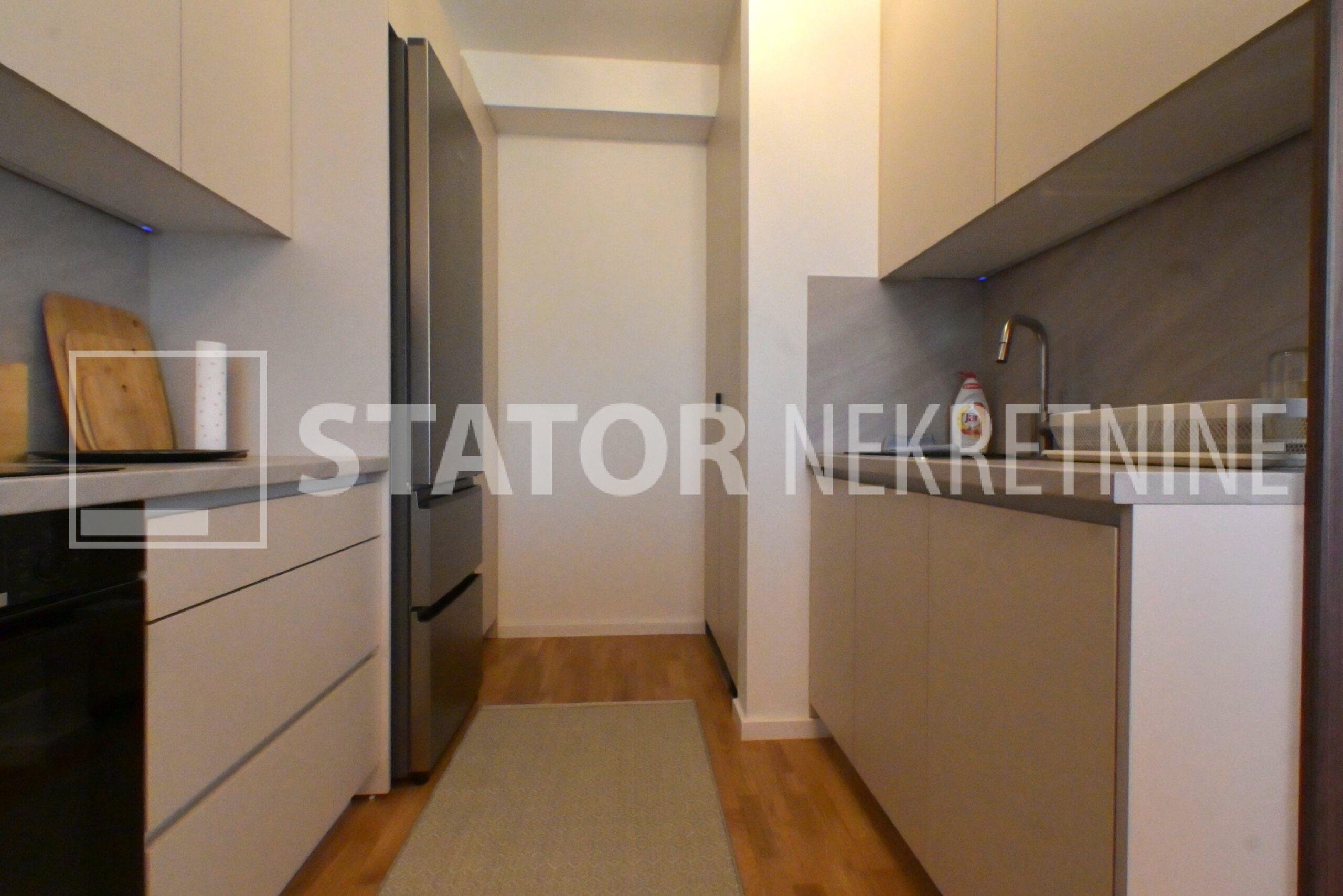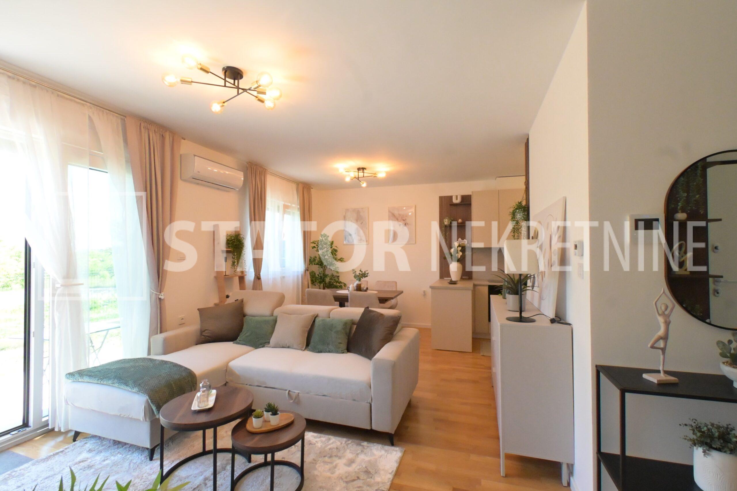 NOVOSELAČKI PUT, iznajmljuje se novi, dvosoban stan u prizemlju zgrade koji se sastoji od ulaznog prostora (4,36 m2), kupaonice (3,99 m2), dnevnog boravka s kuhinjom i blagovaonicom (26,81 m2), te spavaće sobe (11,57 m2), sve zajedno stambene površine površine 54,73 m2. Iz dnevne sobe izlazi se na terasu površine 8,00 m2 i vrt površine 24m2. Stan je u potpunosti namješten i opremljen; hodnik sa ormarom za kapute, komode za odlaganje, dnevna soba sa kutnom garniturom, stolićem za TV i TV – om, u sklopu dnevne sobe je i blagovaonica u kojoj je stol i 4 stolice. Kuhinja rađena po mjeri i maksimalno iskorištenog prostora; kuhinjski elementi sa ugradbenom peći i pećnicom, veliki hladnjak sa škrinjom za zamrzavanje, perilica posuđa, veliki kuhinjski ormari za odlaganje ili ostava, u spavaćoj sobi ugradbeni ormar i bračni krevet, kupaonica sa kadom, ormarićima za odlaganje, u kupaonici je i perilica rublja. Grijanje na dizalice topline, podno, klima. Uz stan dolazi i garaža površine 16,12m2 te mogućnost parkiranja još jednog automobila. ODLIČAN NAMJEŠTEN I U POTPUNOSTI OPREMLJEN STAN SA STILOM U MIRNOM OKRUŽENJU. NA NEKOLIKO KORAKA JE AUTOBUSNA STANICA, MERKET…..Kućni ljubimci nisu dozvoljeni.
