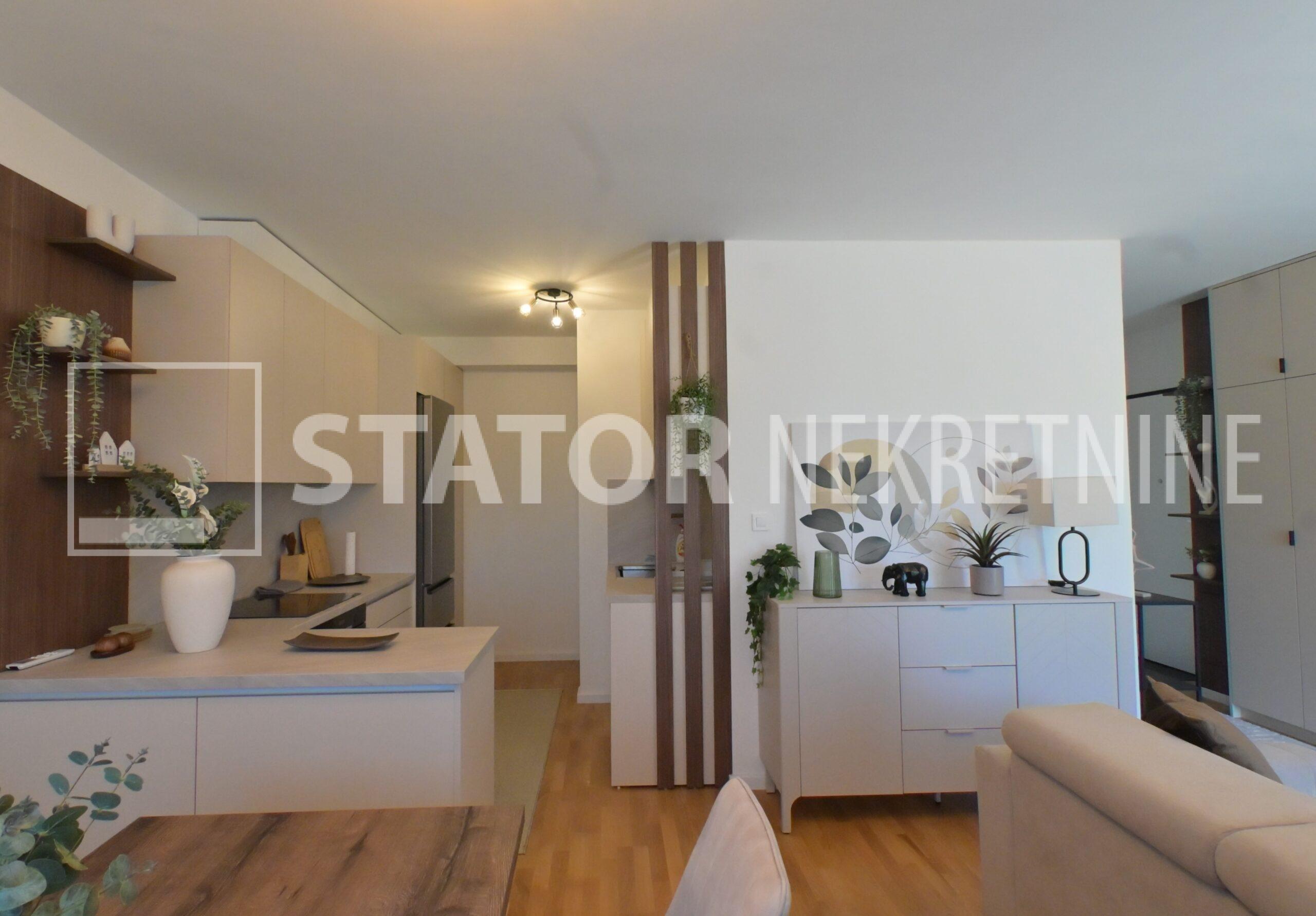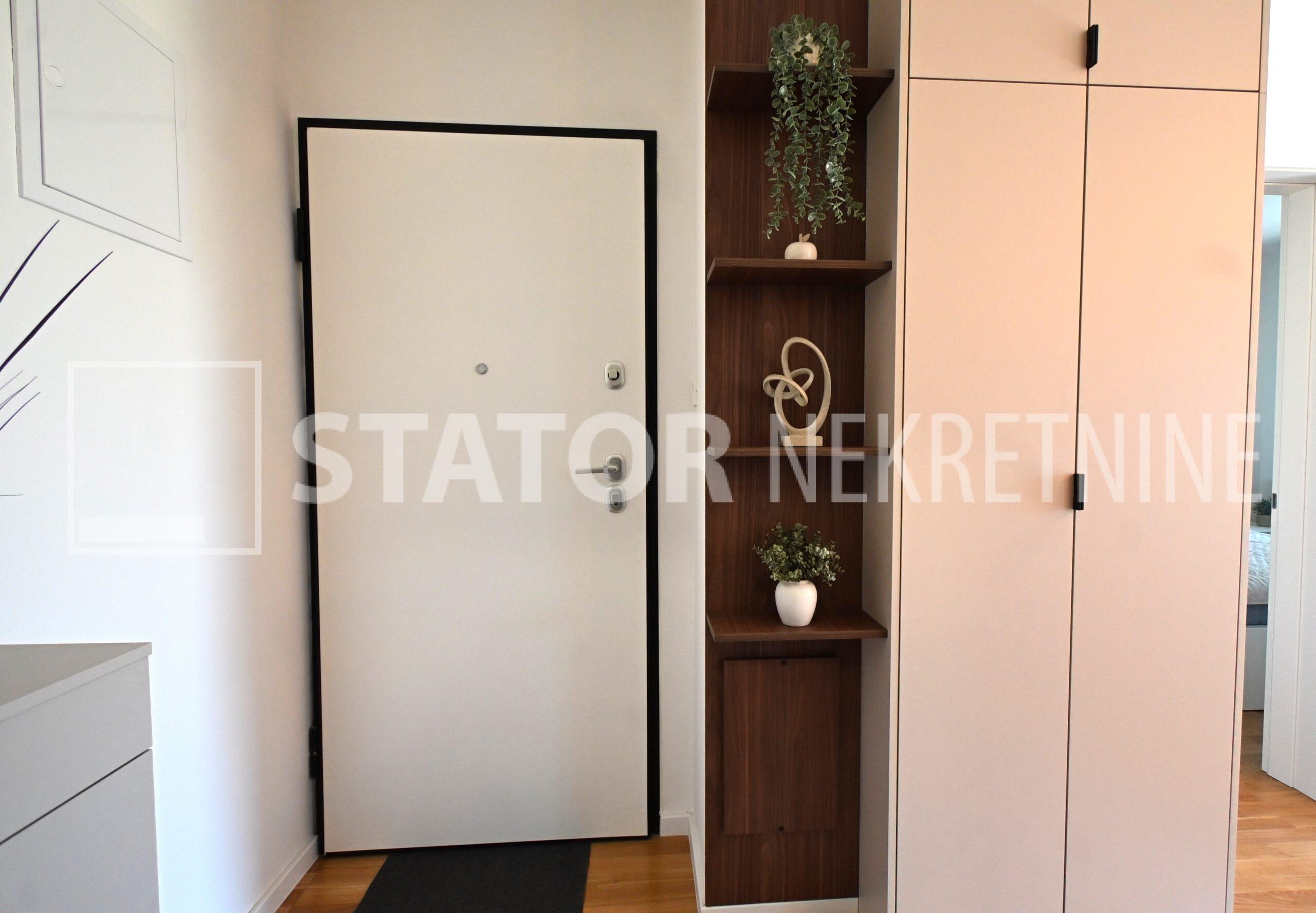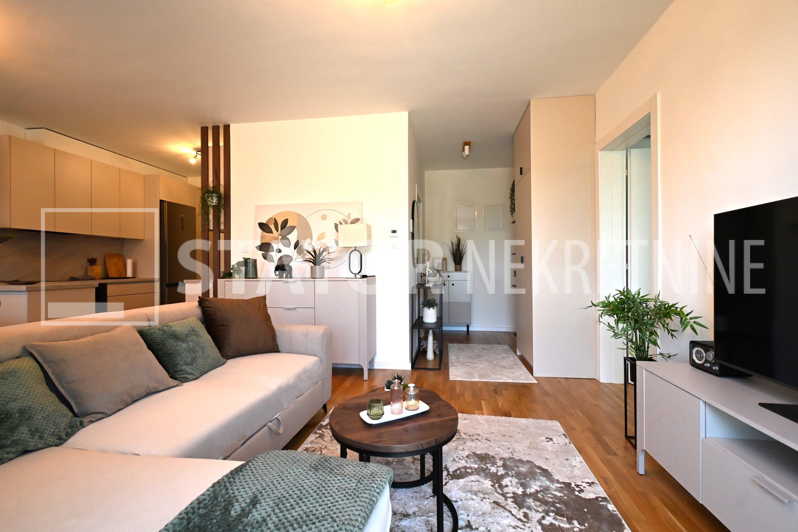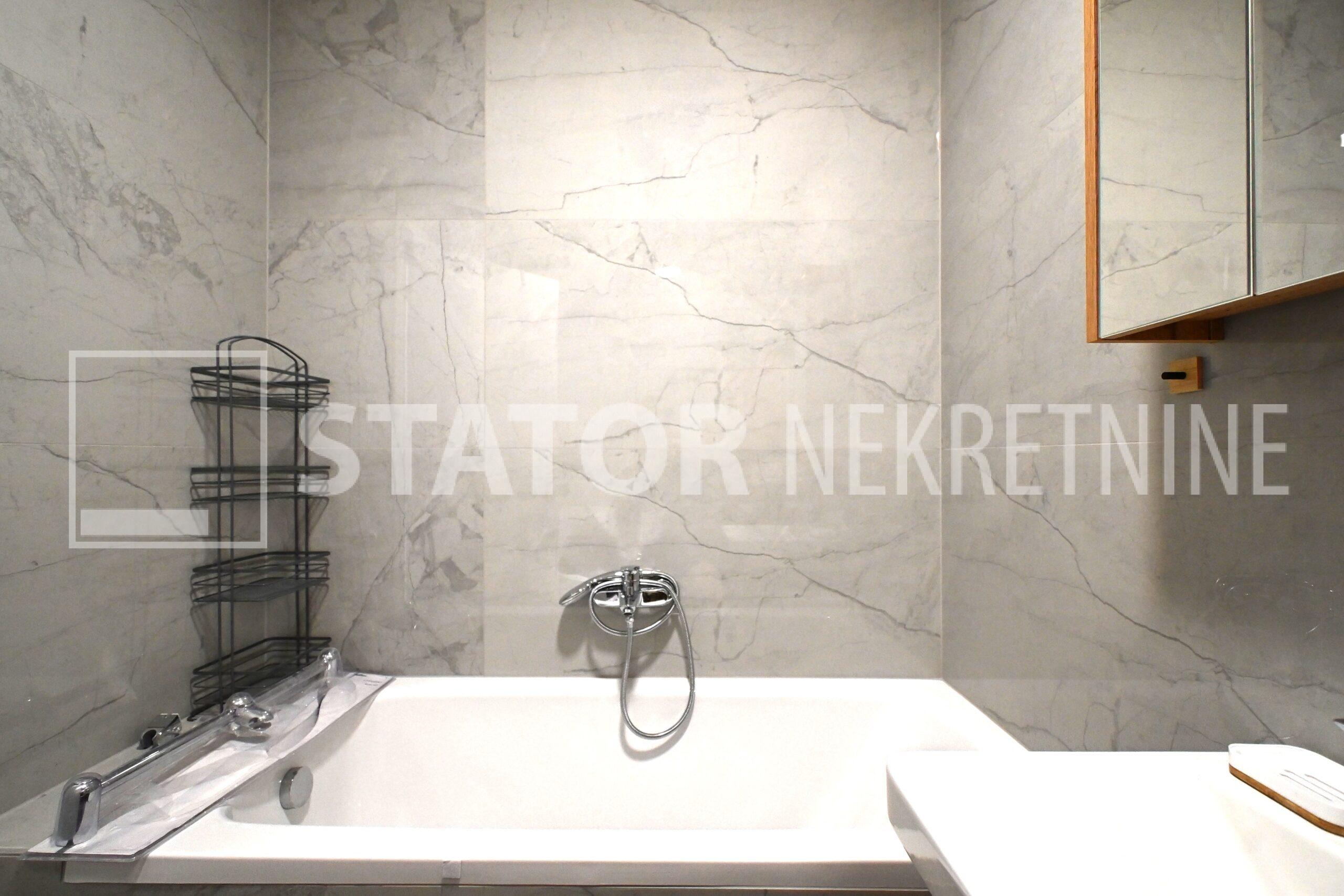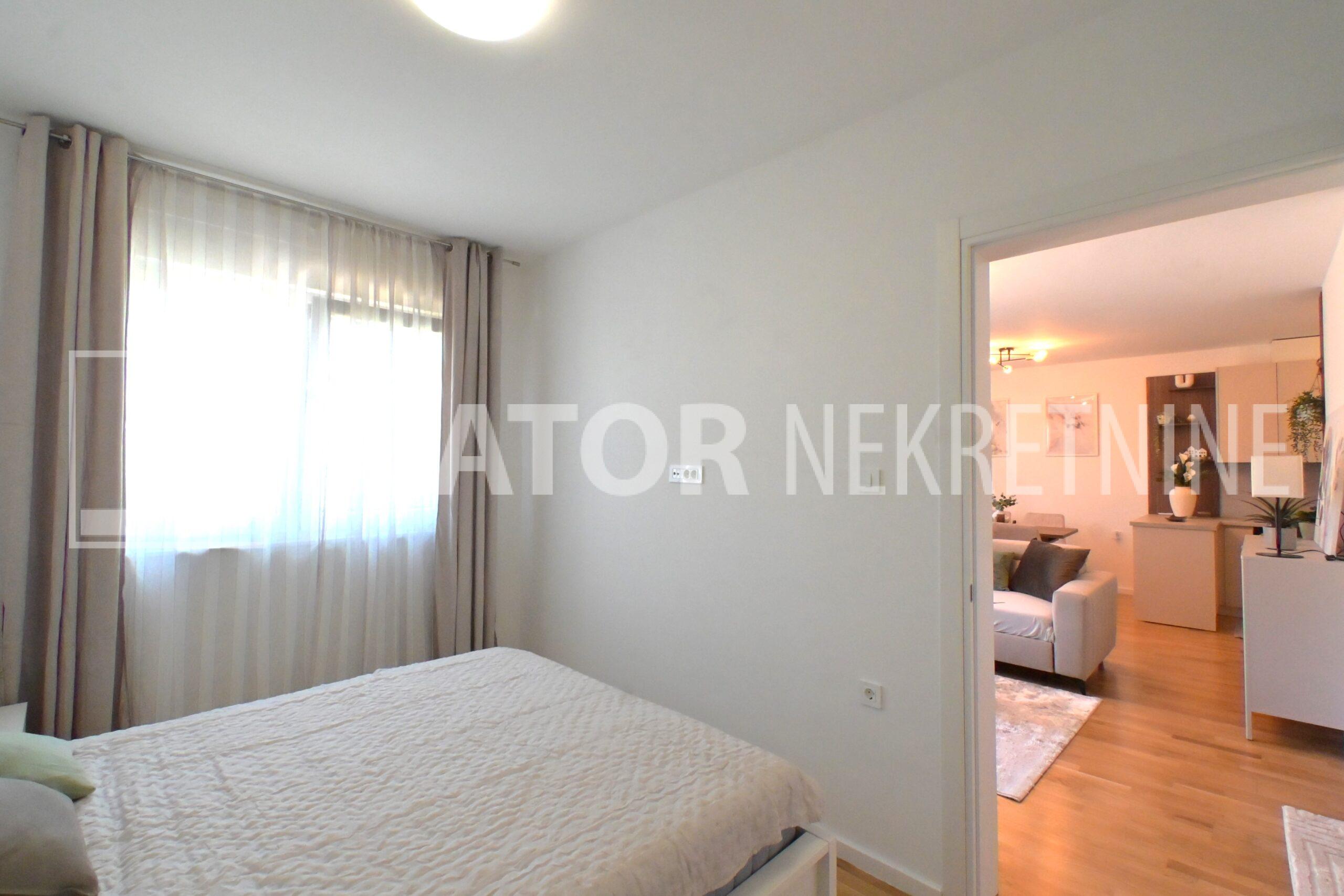 NOVOSELAČKI PUT, iznajmljuje se novi, dvosoban stan u prizemlju zgrade koji se sastoji od ulaznog prostora (4,36 m2), kupaonice (3,99 m2), dnevnog boravka s kuhinjom i blagovaonicom (26,81 m2), te spavaće sobe (11,57 m2), sve zajedno stambene površine površine 54,73 m2. Iz dnevne sobe izlazi se na terasu površine 8,00 m2 i vrt površine 24m2. Stan je u potpunosti namješten i opremljen; hodnik sa ormarom za kapute, komode za odlaganje, dnevna soba sa kutnom garniturom, stolićem za TV i TV – om, u sklopu dnevne sobe je i blagovaonica u kojoj je stol i 4 stolice. Kuhinja rađena po mjeri i maksimalno iskorištenog prostora; kuhinjski elementi sa ugradbenom peći i pećnicom, veliki hladnjak sa škrinjom za zamrzavanje, perilica posuđa, veliki kuhinjski ormari za odlaganje ili ostava, u spavaćoj sobi ugradbeni ormar i bračni krevet, kupaonica sa kadom, ormarićima za odlaganje, u kupaonici je i perilica rublja. Grijanje na dizalice topline, podno, klima. Uz stan dolazi i garaža površine 16,12m2 te mogućnost parkiranja još jednog automobila. ODLIČAN NAMJEŠTEN I U POTPUNOSTI OPREMLJEN STAN SA STILOM U MIRNOM OKRUŽENJU. NA NEKOLIKO KORAKA JE AUTOBUSNA STANICA, MERKET…..Kućni ljubimci nisu dozvoljeni.
