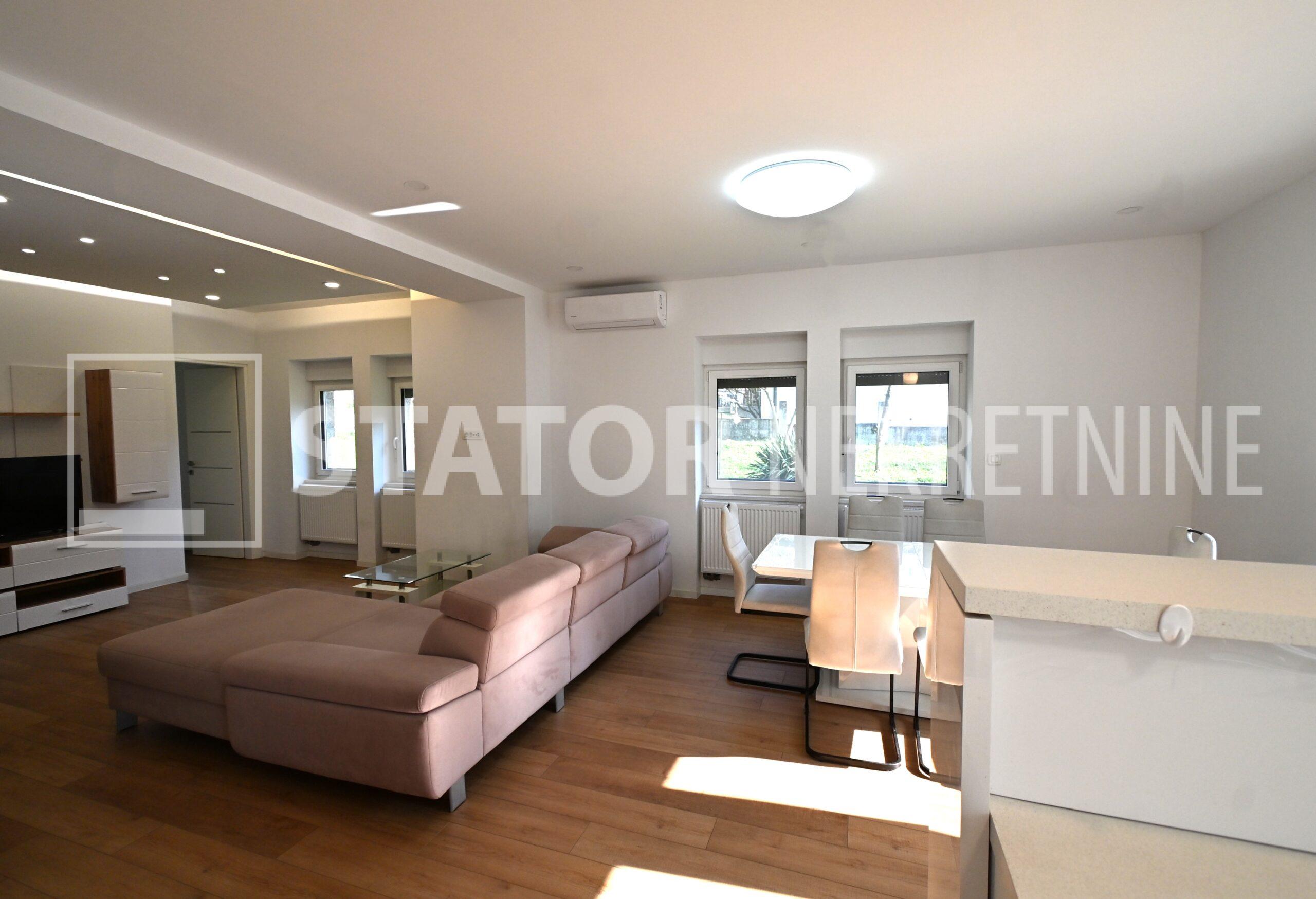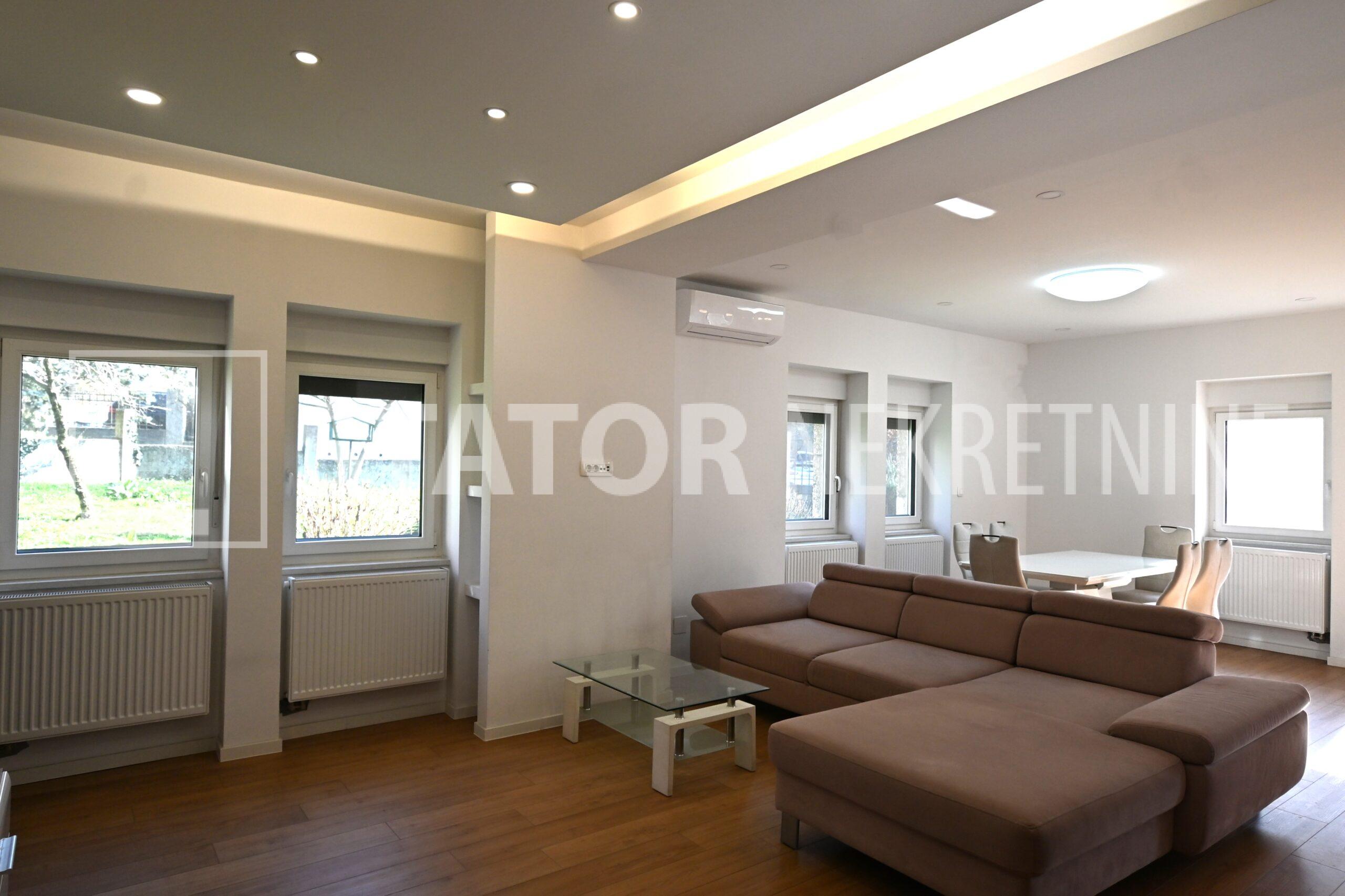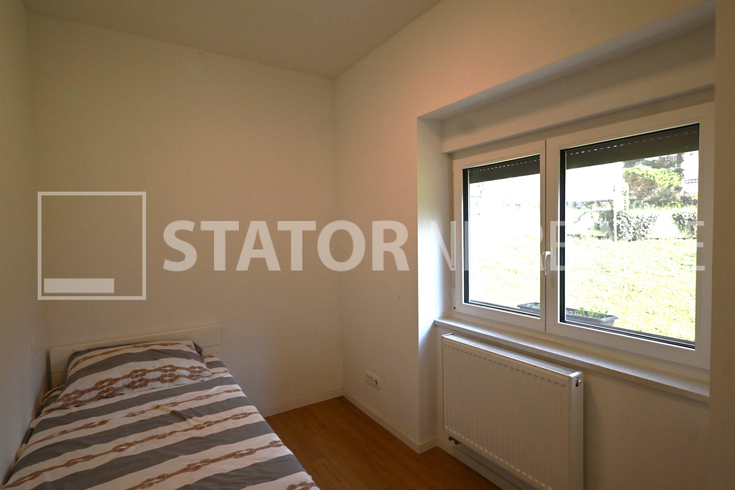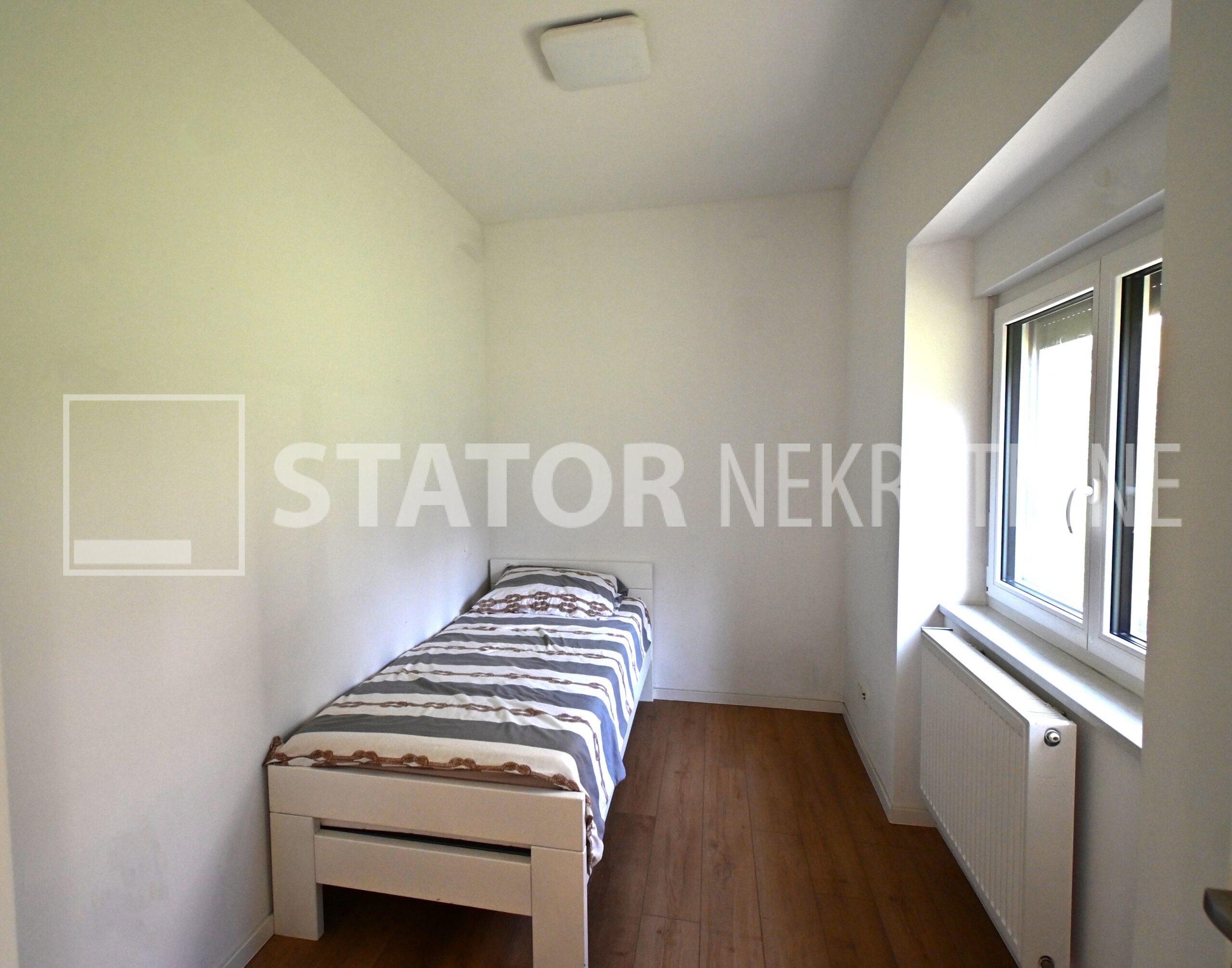 ZELENGAJ, iznajmljuje se četverosobni, uredo održavan stan u prizemlju zgrade reprezentativnog ulaza. Sastoji se od hodnika u kojem su i ugradbeni ormari. Desno od ulaza nalazi se dnevni boravak u sklopu kojeg je i kuhinja sa blagovaonicom, sve okrenuto na uličnu stranu. Lijevo od ulaza su tri spavaće sobe i dvije kupaonice. Roditeljska, veća spavaća soba namještena je sa bračnim krevetom i ormarima ima i vlastitu kupaonicu sa WC – om. Dvije manje sobe opremljene su sa krevetima za jedu osobu i također sa ormarima. Pored soba je druga kupaonica. Kuhinja je također u potpunosti namještena i opremljena, elementi i kuhinjski otok rađeni po mjeri, perilica posuđa i veliki hladnjak sa škrinjom za zamrzavanje. Dnevni prostor sa udubnom garniturom u L, police za odlaganje i TV, prostor za blagovanje sa stolom i 8 stolica. U jednoj od kupaonica je perilica rublja. Grijanje je etažno, plinsko, klima. U prizemlju lijevo od ulaza nalazi se ostava za bicikle, skije, kutije ili jednostavno prostor za odlaganje. S OBZIROM NA POLOŽAJ I OTVORENOST VRTA KOJI OKRUŽUJE ZGRADU STAN JE SVIJETAO I UGODAN ZA STANOVANJE. NA SAMO NEKOLIKO MINUTA JE BRUTANAC, TRŽNICA, PREKO PUTA ZGRADE PARK I ŠUMA, AUTOBUSNA STANICA…MIRNO I TIHO OKRUŽENJE!!! PREPORUKA!!!
