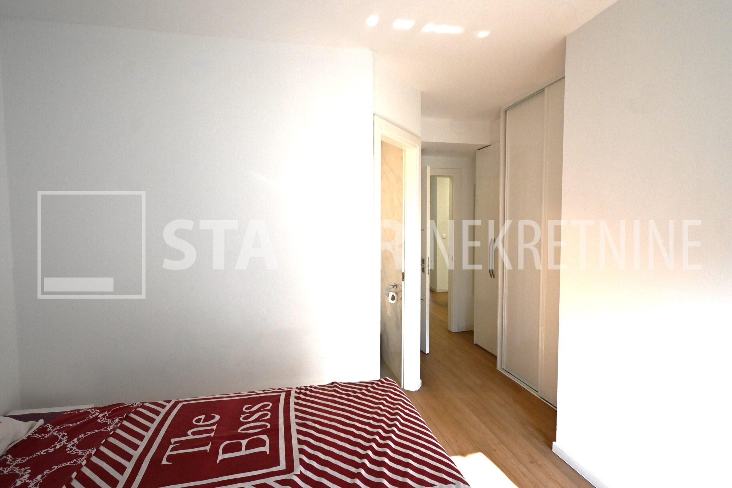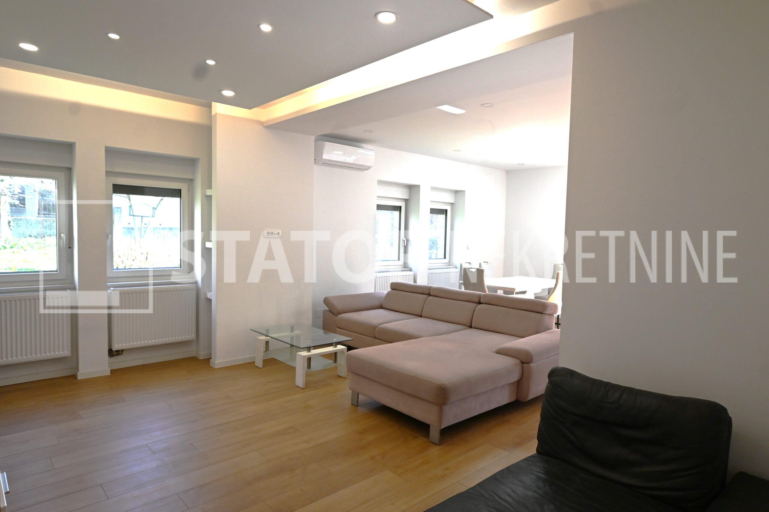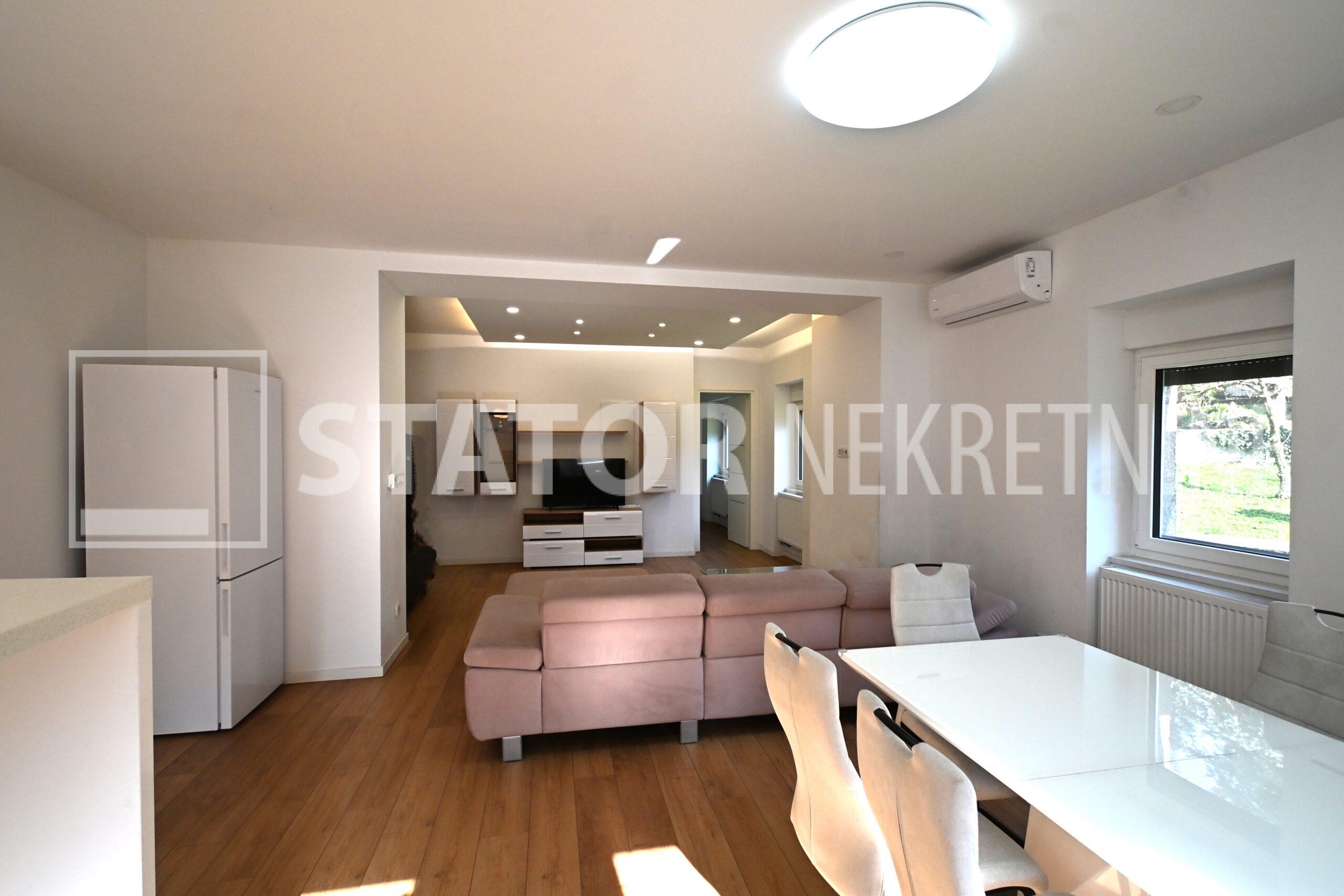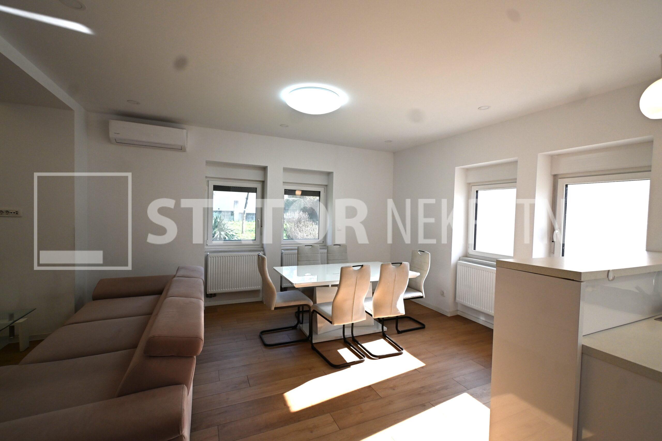 ZELENGAJ, iznajmljuje se četverosobni, uredo održavan stan u prizemlju zgrade reprezentativnog ulaza. Sastoji se od hodnika u kojem su i ugradbeni ormari. Desno od ulaza nalazi se dnevni boravak u sklopu kojeg je i kuhinja sa blagovaonicom, sve okrenuto na uličnu stranu. Lijevo od ulaza su tri spavaće sobe i dvije kupaonice. Roditeljska, veća spavaća soba namještena je sa bračnim krevetom i ormarima ima i vlastitu kupaonicu sa WC – om. Dvije manje sobe opremljene su sa krevetima za jedu osobu i također sa ormarima. Pored soba je druga kupaonica. Kuhinja je također u potpunosti namještena i opremljena, elementi i kuhinjski otok rađeni po mjeri, perilica posuđa i veliki hladnjak sa škrinjom za zamrzavanje. Dnevni prostor sa udubnom garniturom u L, police za odlaganje i TV, prostor za blagovanje sa stolom i 8 stolica. U jednoj od kupaonica je perilica rublja. Grijanje je etažno, plinsko, klima. U prizemlju lijevo od ulaza nalazi se ostava za bicikle, skije, kutije ili jednostavno prostor za odlaganje. S OBZIROM NA POLOŽAJ I OTVORENOST VRTA KOJI OKRUŽUJE ZGRADU STAN JE SVIJETAO I UGODAN ZA STANOVANJE. NA SAMO NEKOLIKO MINUTA JE BRUTANAC, TRŽNICA, PREKO PUTA ZGRADE PARK I ŠUMA, AUTOBUSNA STANICA…MIRNO I TIHO OKRUŽENJE!!! PREPORUKA!!!